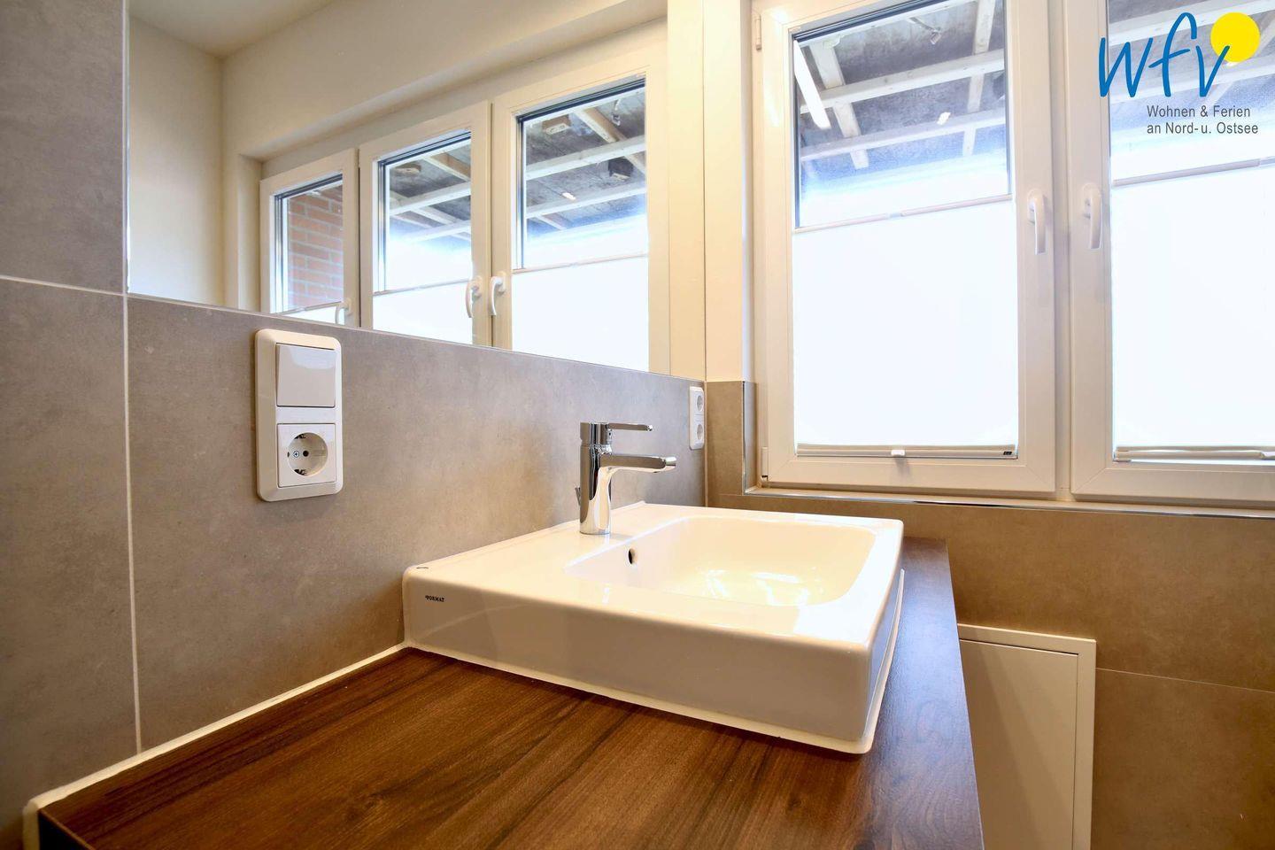 Das natürlich belichtete Bad ist elegant gehalten und mit einer bodengleichen Dusche, einem Handtuchheizkörper und einem großen Waschtisch ausgestattet. So wird auch dieser Raum zum Wohlfühlort.