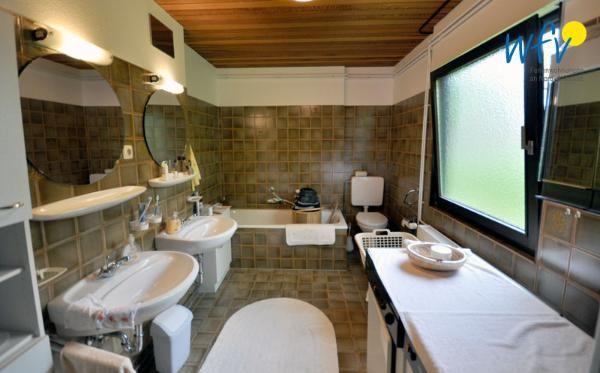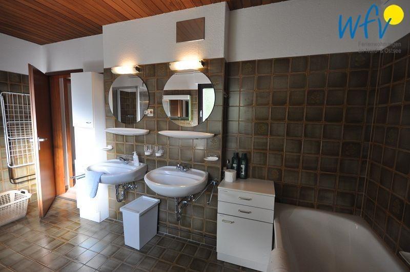 Das Bad verfügt über zwei Waschbecken, Dusche, Badewanne, Fön, Wäschetrockner und Waschmaschine.