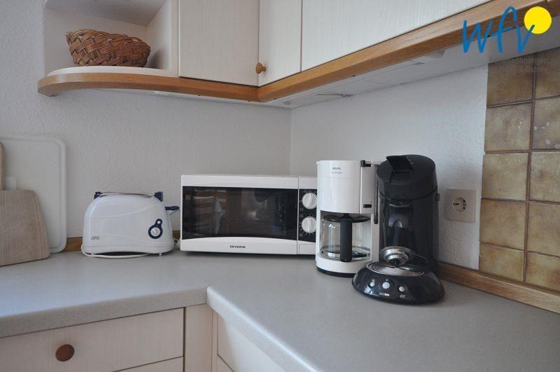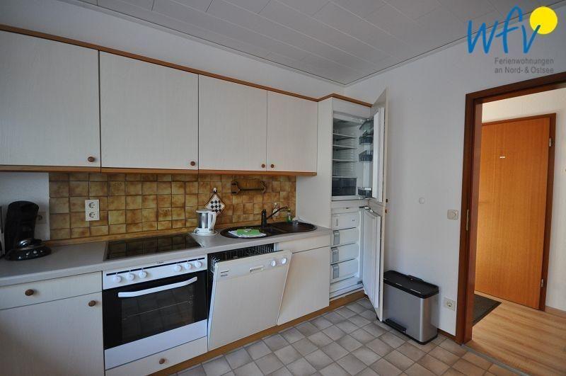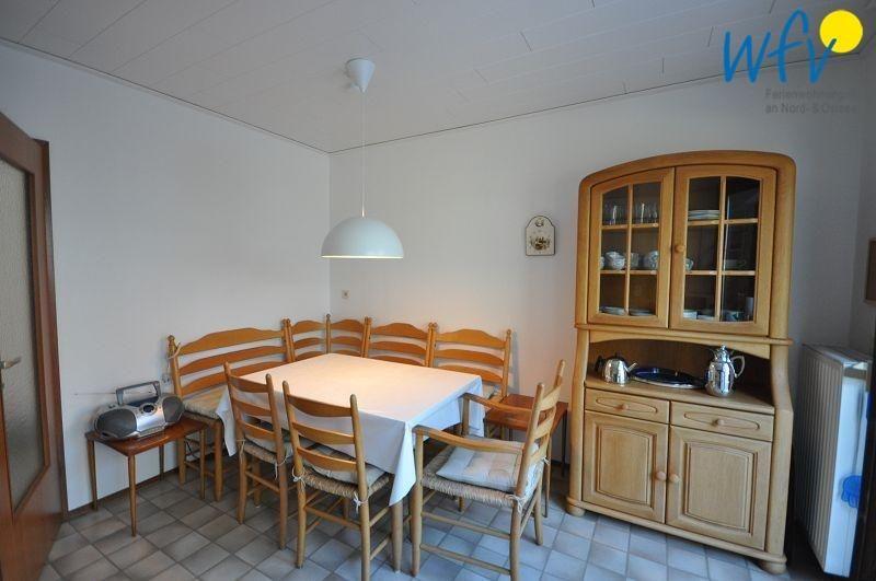 Die große Essküche des Wangerooger Ferienhauses lädt zu gemütlichen gemeinsamen Mahlzeiten ein! Sie ist u.a. mit Herd, Backofen, Mikrowelle, Geschirrspüler und Gefrierschrank ausgestattet sowie mit diversen Kleingeräten (Kaffeemaschine, Toaster und Wasserkocher).