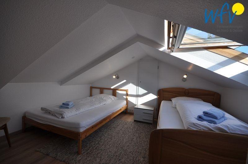 Für vier Personen sind zwei separate Schlafzimmer vorhanden. Das Kinderschlafzimmer mit zwei großen Betten befindet sich unter dem Dach und ist über eine Bodentreppe (Ausziehleiter) erreichbar. Daher ist es besonders für ältere Kinder geeignet.