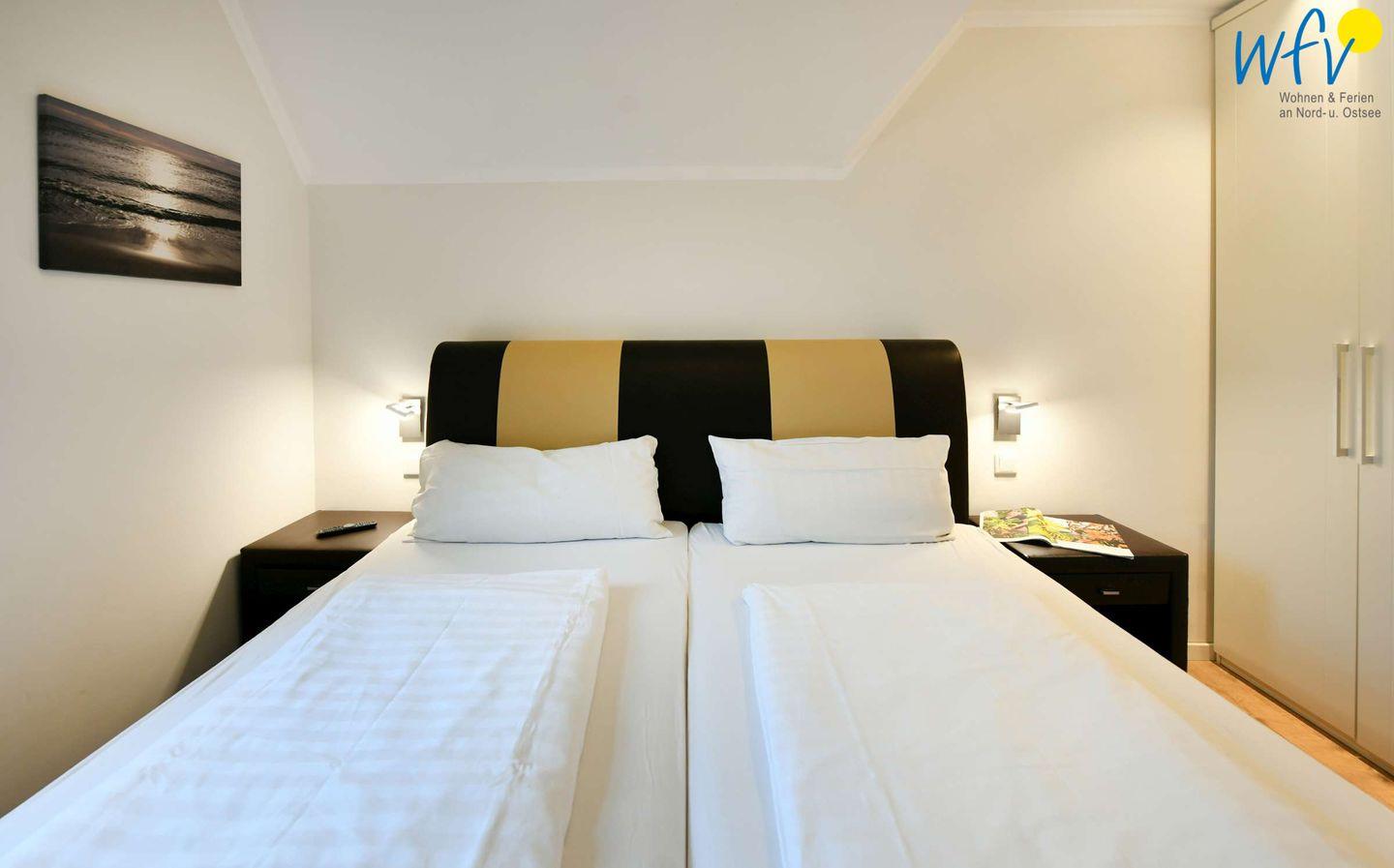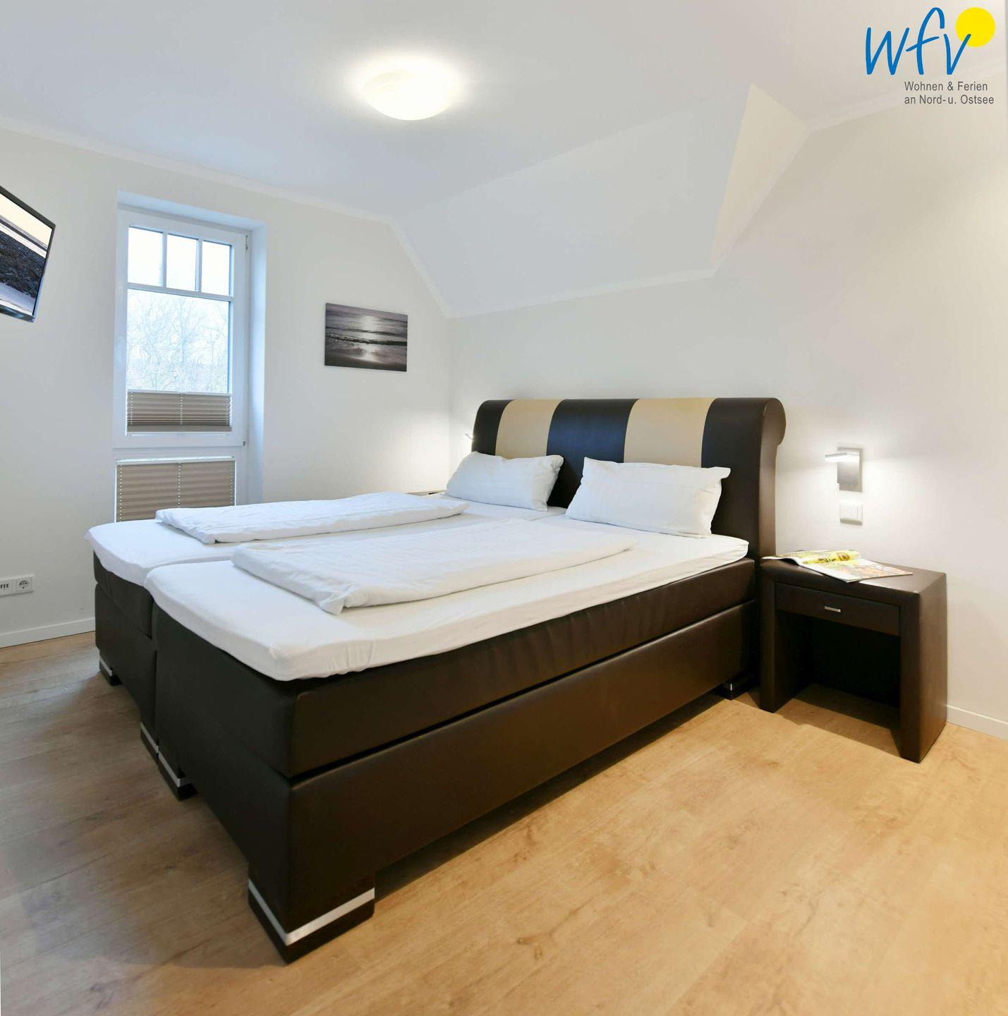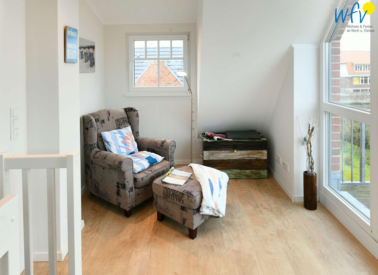 Zwei separate Schlafzimmer bieten Ihnen angenehme Rückzugsmöglichkeiten. Eines der Schlafzimmer (OG) ist mit einem Doppelbett (Boxbett 180 x 200 cm) sowie mit einem TV und einem Kleiderschrank ausgestattet. Das andere Schlafzimmer befindet sich im Dachgeschoss und verfügt über zwei zusammenschiebbare Einzelbetten (je 90 x 200 cm), ein TV und eine Kommode. Angrenzend erwartet Sie hier ein zusätzlicher gemütlicher Wohnbereich mit Leseecke und Balkon.