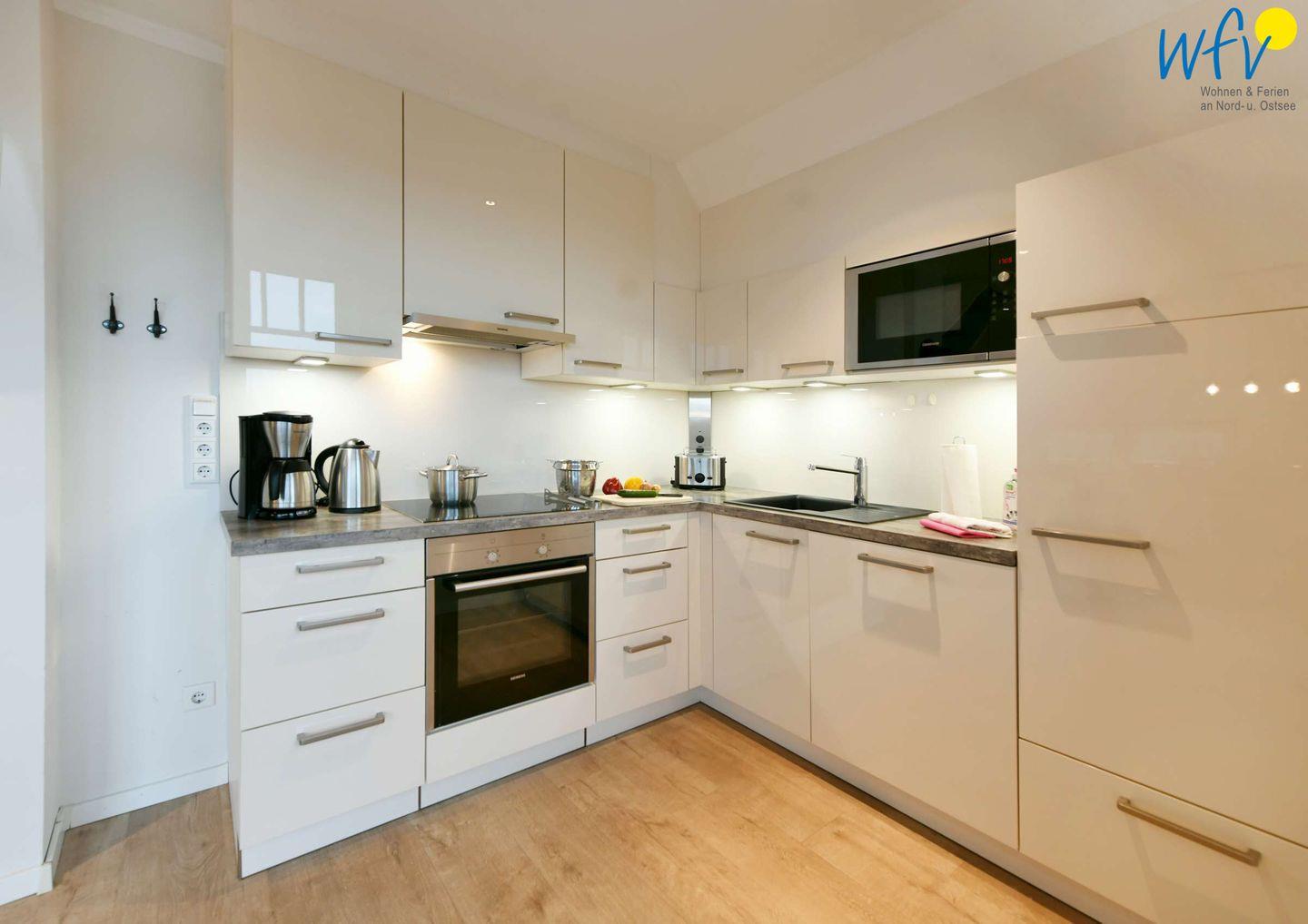 Hoher Wohnkomfort erwartet Sie auch in der modernen Wohnküche mit Kühlschrank & integriertem 4-Sterne (17l) Gefrierfach, Backofen, Induktionsherd, Mikrowelle und Geschirrspüler. Oder möchten Sie beim Abendessen noch etwas Nordseeluft schnuppern? Auf der großen Terrasse mit Gartenmöbeln und Strandkorb können Sie wunderbar den Urlaubstag ausklingen lassen und den herrlichen Dünenblick genießen.