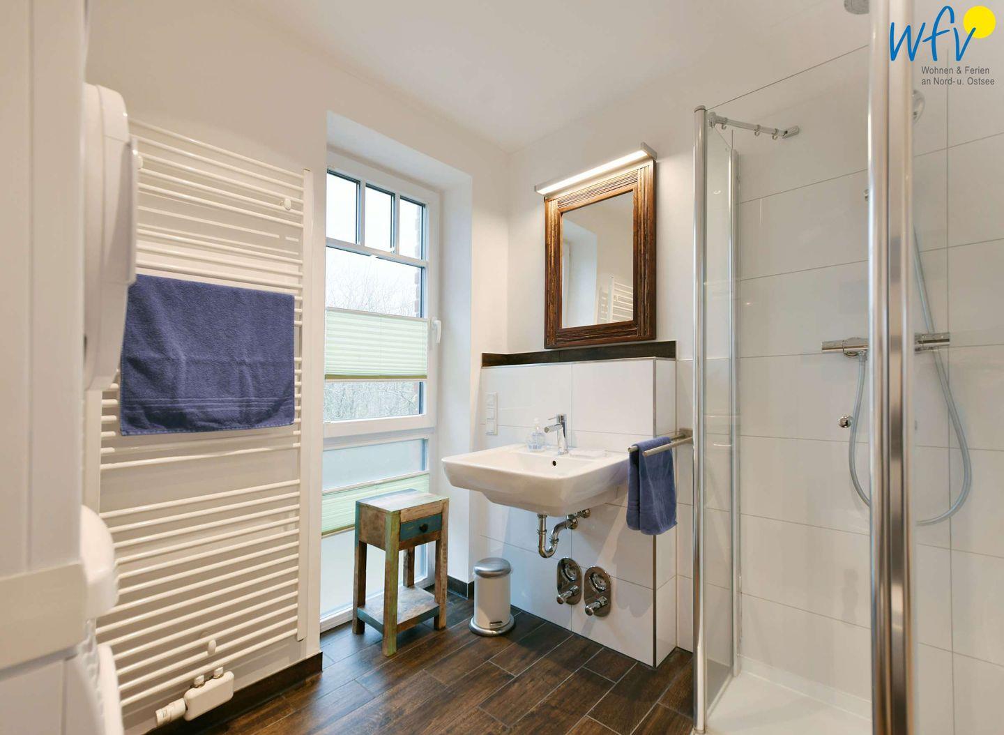 Das elegante Tageslichtbad mit Dusche, Waschbecken, Spiegel, WC, Föhn und Handtuchheizung sorgt für weiteren Wohnkomfort. Hier stehen Ihnen außerdem Waschmaschine und Trockner zur Verfügung.