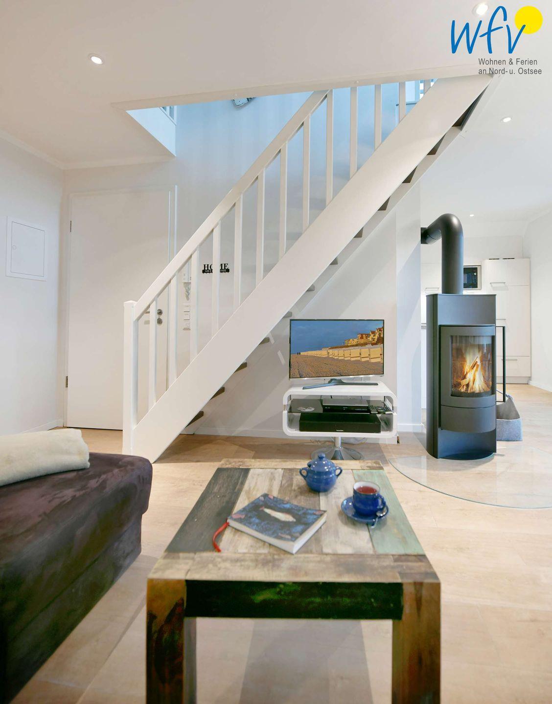 Eine moderne Einrichtung in harmonischen Farben vermittelt auf Anhieb eine Wohlfühlatmosphäre. Maritime Accessoires sorgen für die entsprechende Nordseenote in Ihrem Urlaub am Meer. Nach der Fahrradtour oder dem Strandtag lädt der offene Wohnraum mit einem großen Esstisch sowie einer Couchecke mit TV, Radio, DVD-Player und CD-Player zu entspannten Stunden ein. An kühleren Tagen wird es am Kaminofen sehr behaglich.