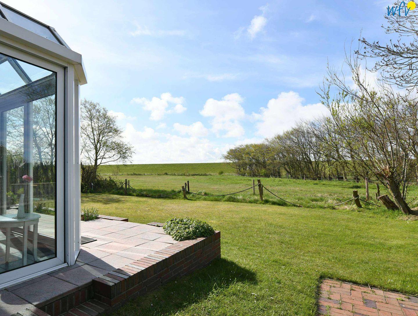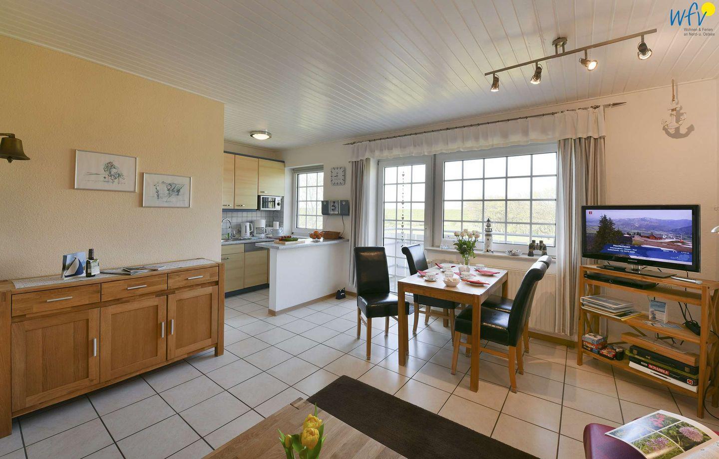 Die bequeme Couchecke mit Satellit-TV (Flachbildschirm), DVD-Player und Stereoanlage lädt zum ausgiebigen Entspannen ein. Vom Esstisch aus genießen Sie einen schönen Blick auf den Deich. Und auch auf dem sonnigen Südbalkon mit herrlichem Ausblick ins Grüne werden Sie sich rundum wohlfühlen - der perfekte Ort für Erholung an der frischen Nordseeluft!