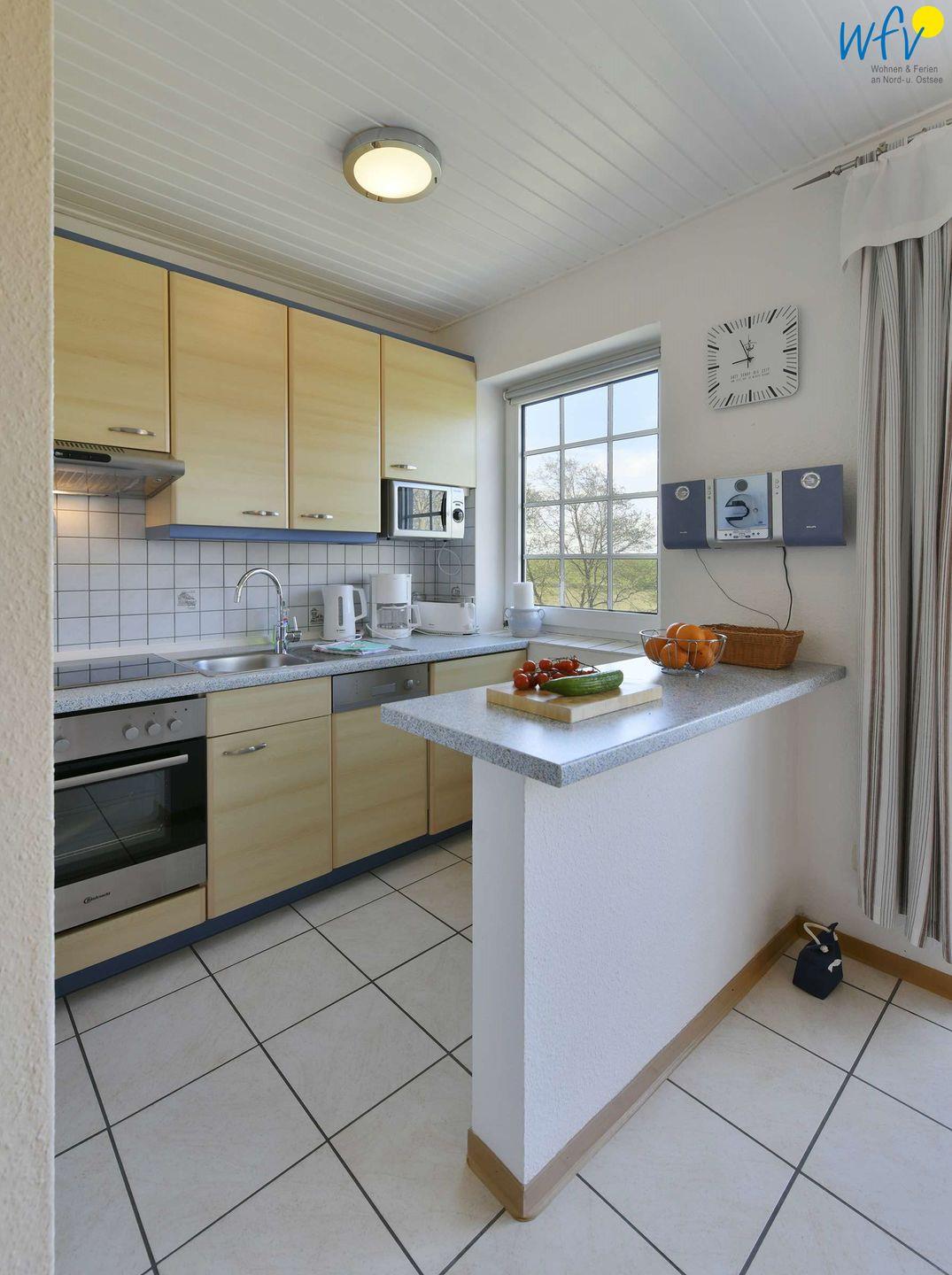 Die Kochnische im Wohnzimmer ermöglicht Ihnen eine angenehme Selbstverpflegung; sie ist u.a. mit Spülmaschine, Ceranfeld, Backofen und Mikrowelle ausgestattet. Die Küche und das Wohnzimmer sind durch eine praktische Sidebar voneinander getrennt.