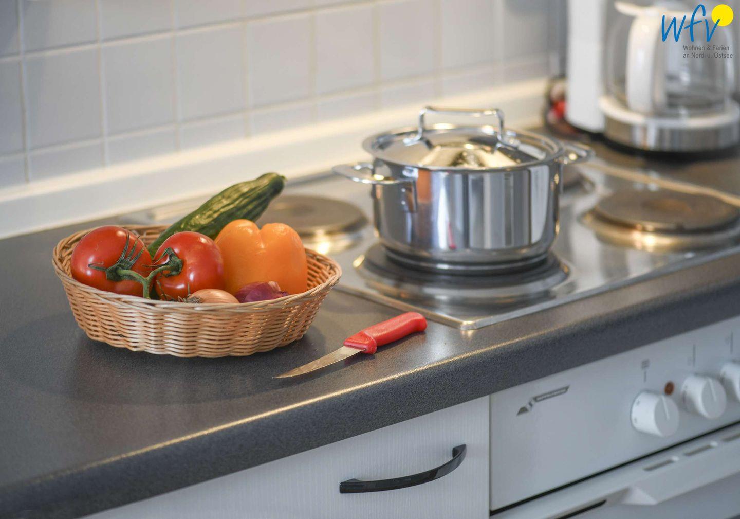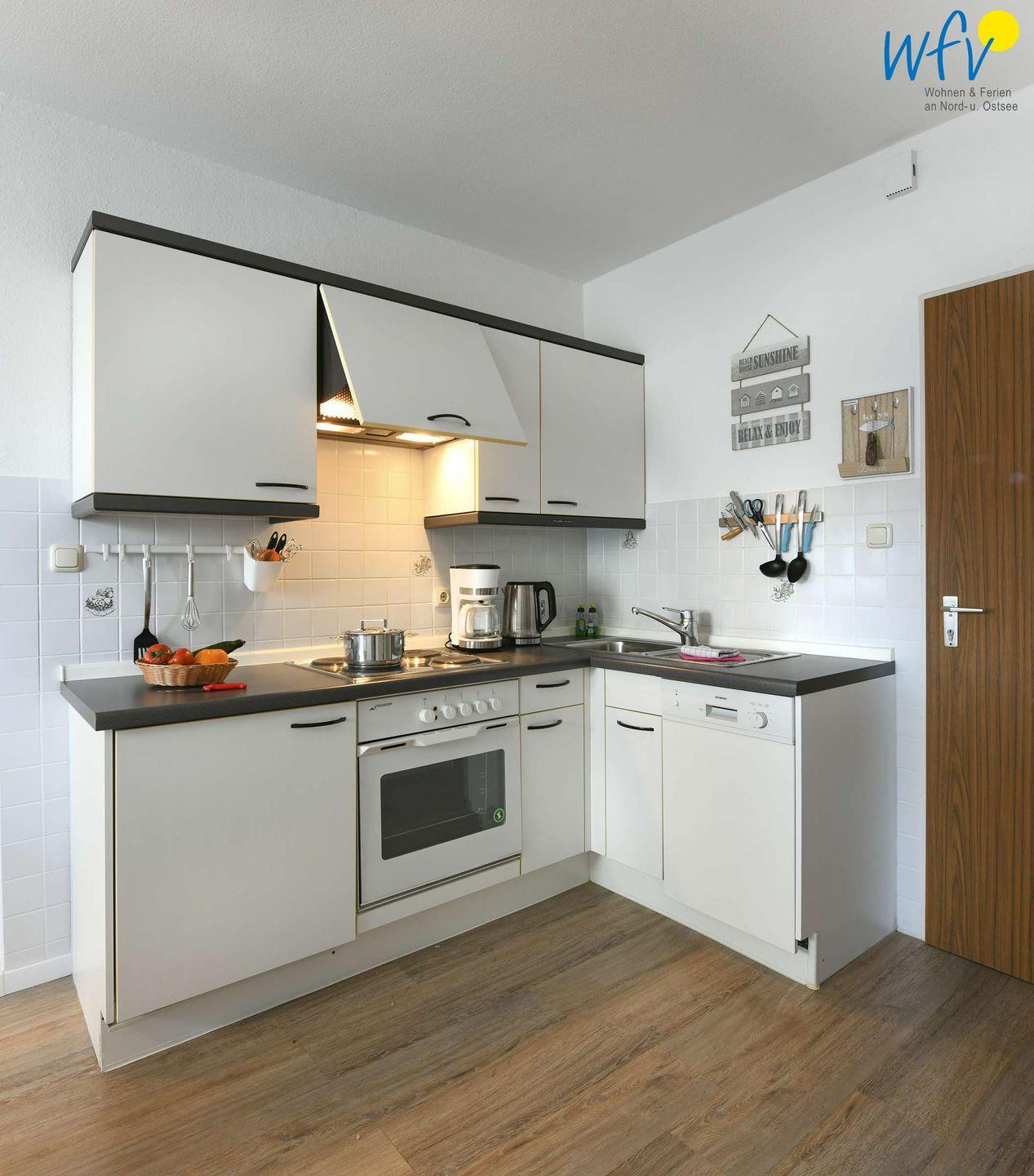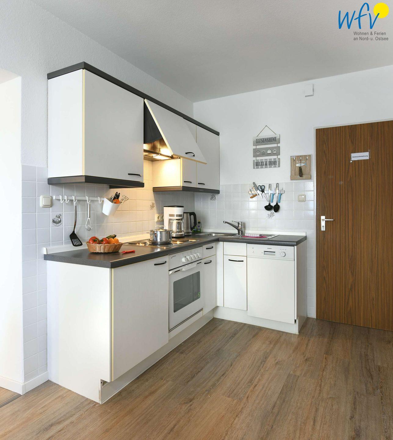 Für eine bequeme Selbstverpflegung ist die Küche voll ausgestattet (u.a. mit Herd, Backofen und Geschirrspüler sowie Kaffeemaschine, Toaster und Wasserkocher). Zudem befindet sich hier ein schöner Essplatz mit Blick nach draußen.