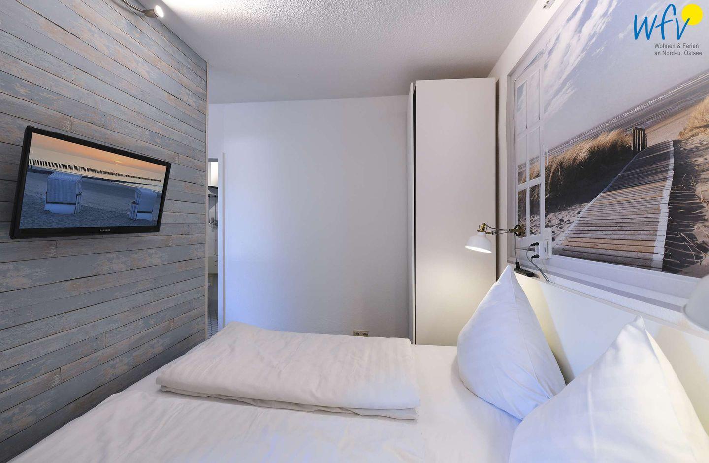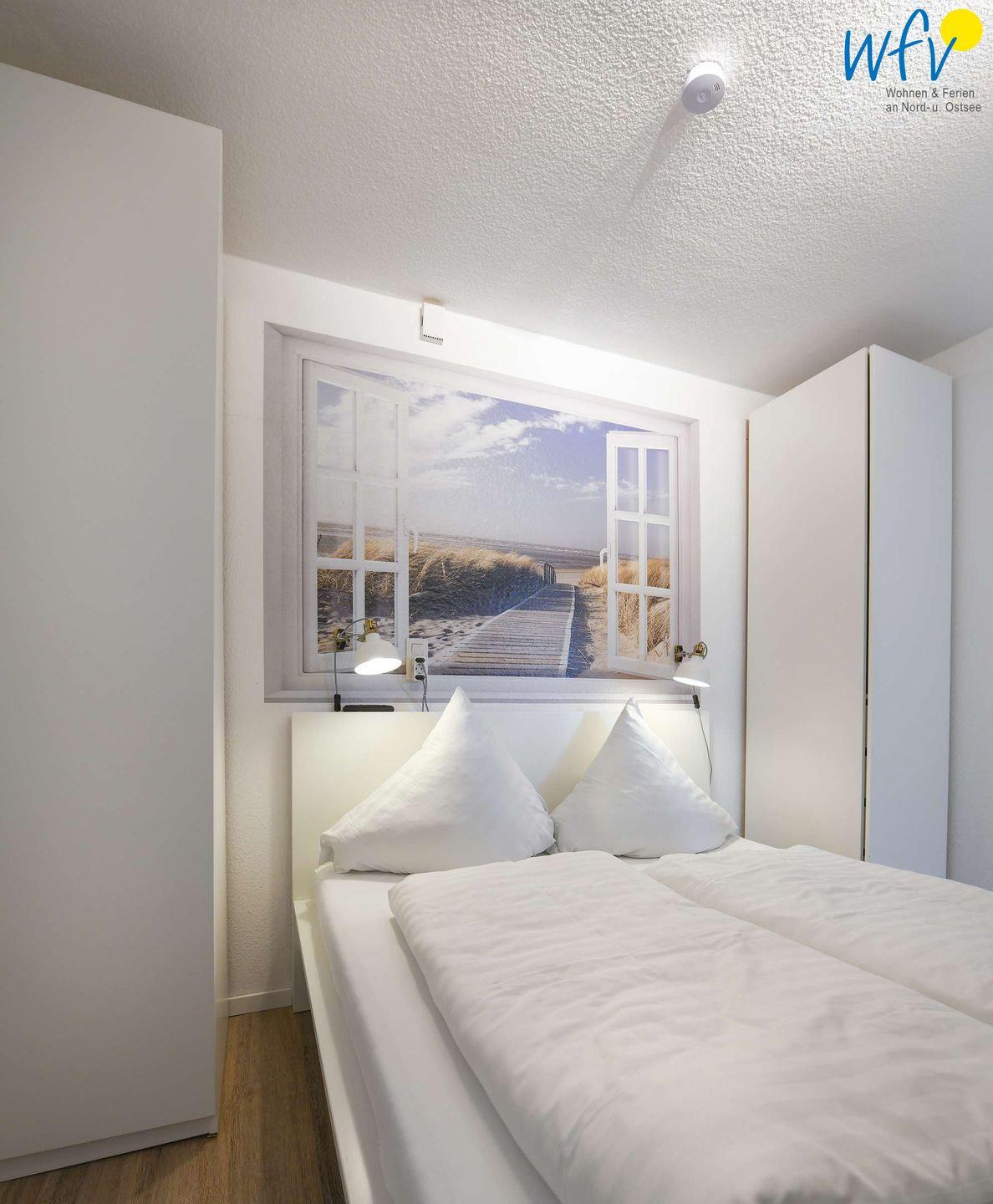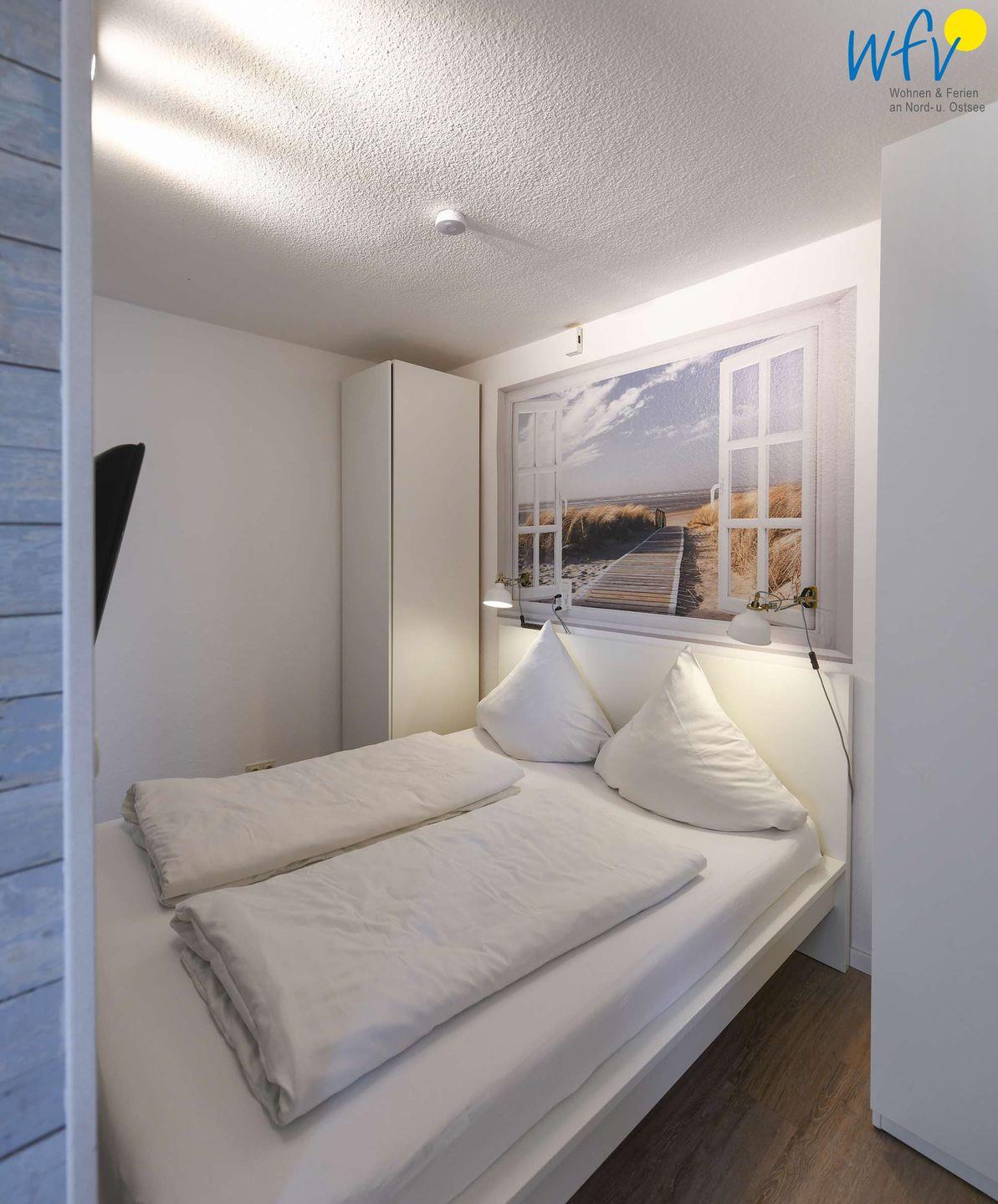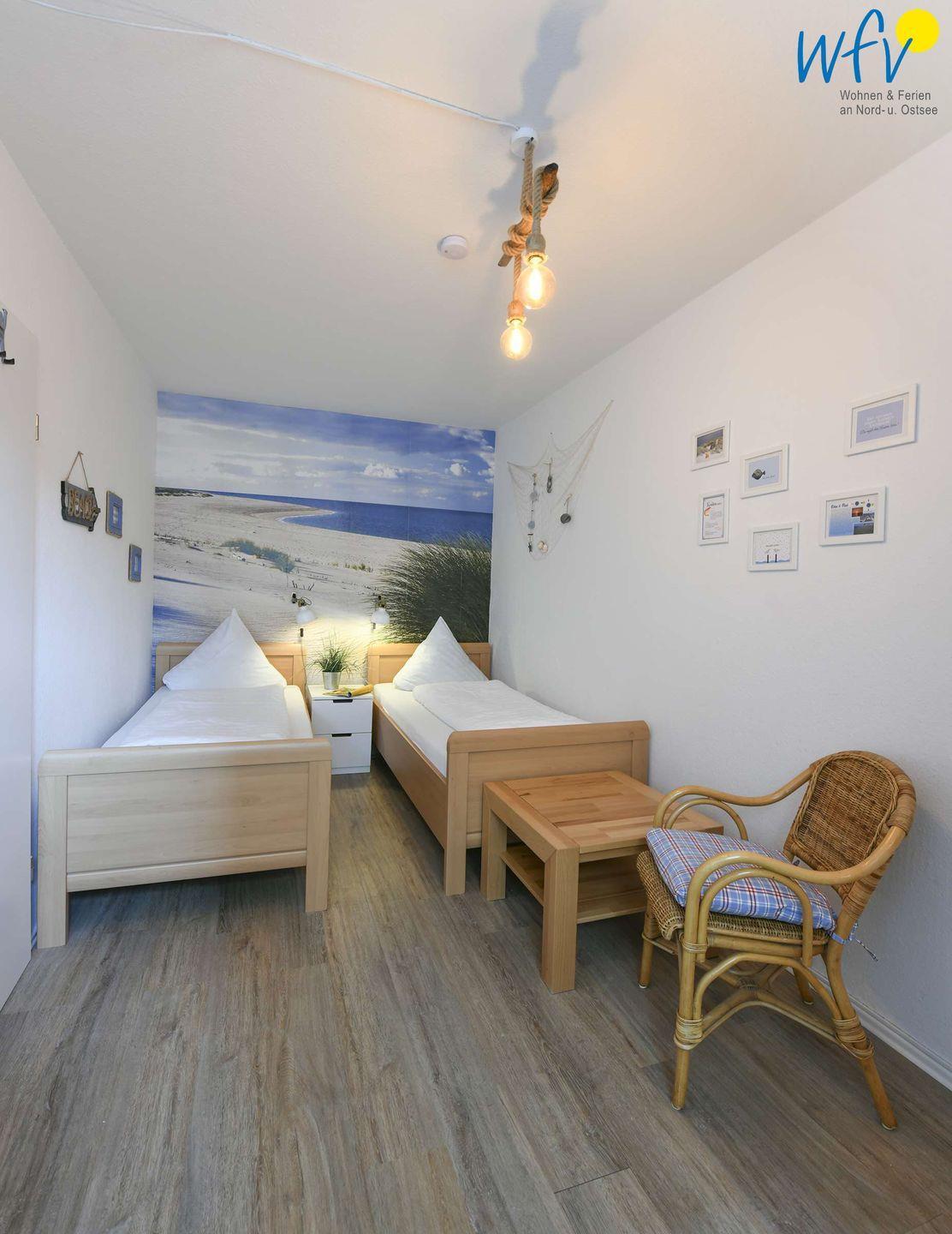 Der separate Schlafraum ist mit zwei bequemen Einzelbetten eingerichtet. Zusätzlich steht Ihnen ein Doppelbett zur Verfügung, das sich hinter einem Raumteiler im Wohnraum befindet. Ein Kinderbett gehört zum festen Inventar dieser Ferienwohnung und kann ohne Aufpreis von Ihnen genutzt werden.