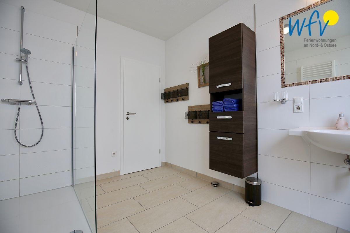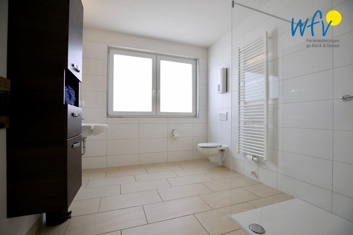 Das große gepflegte Bad verfügt über Waschbecken und WC sowie über eine ebenerdige Dusche und eine Handtuchheizung. Zusätzlich gibt es ein Gäste-WC.