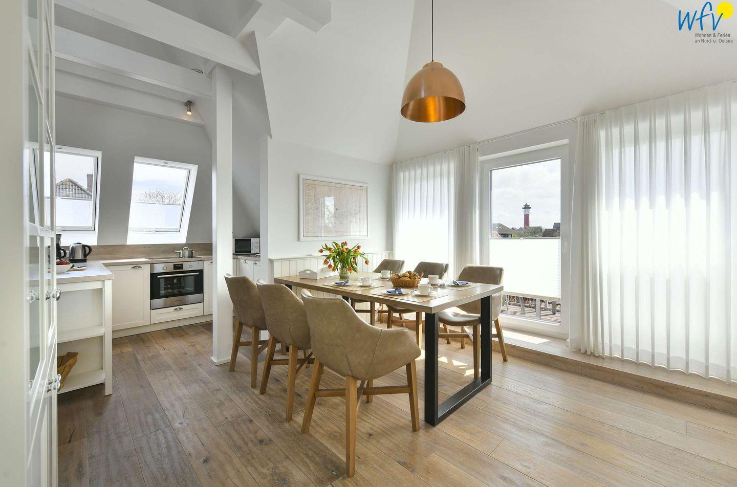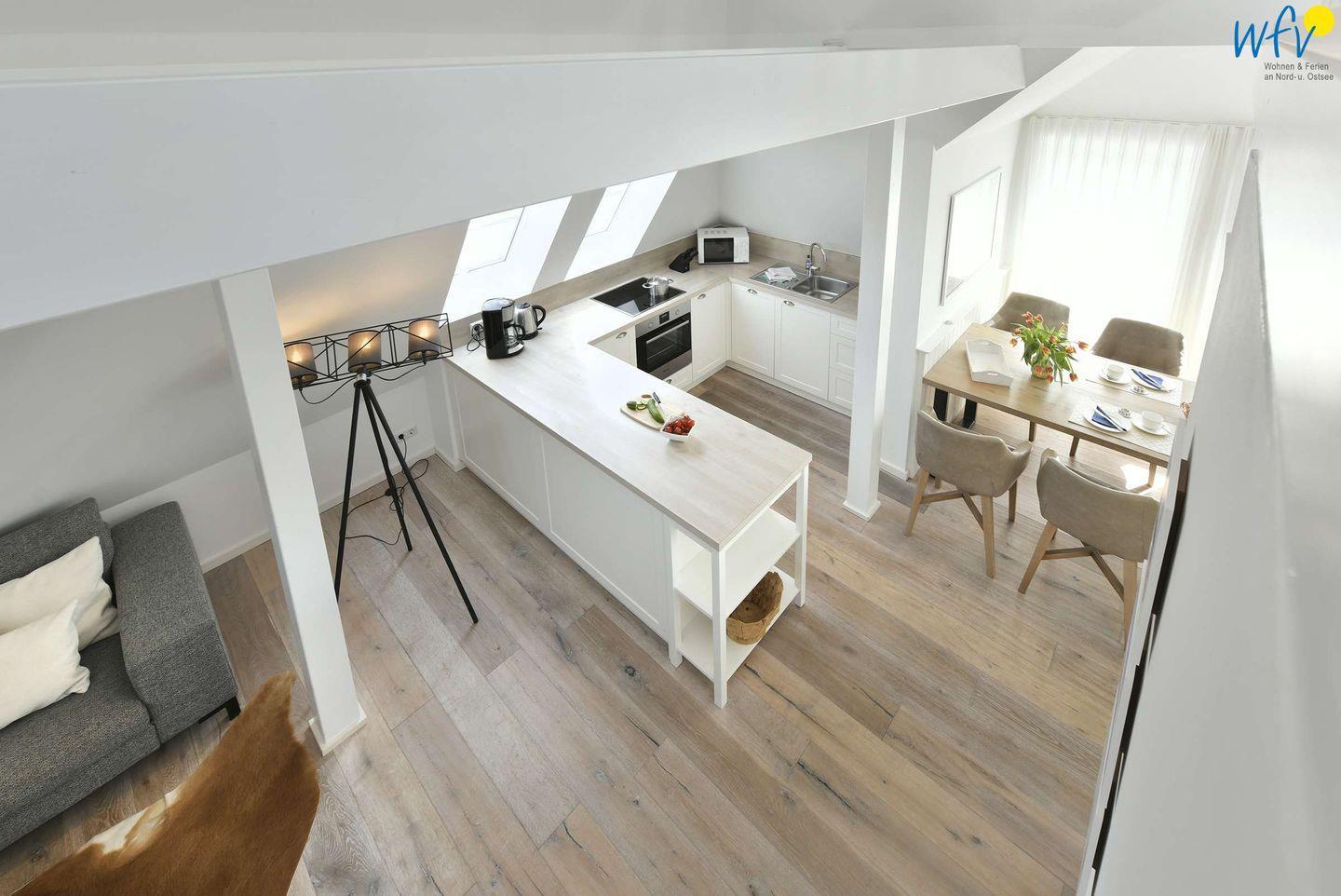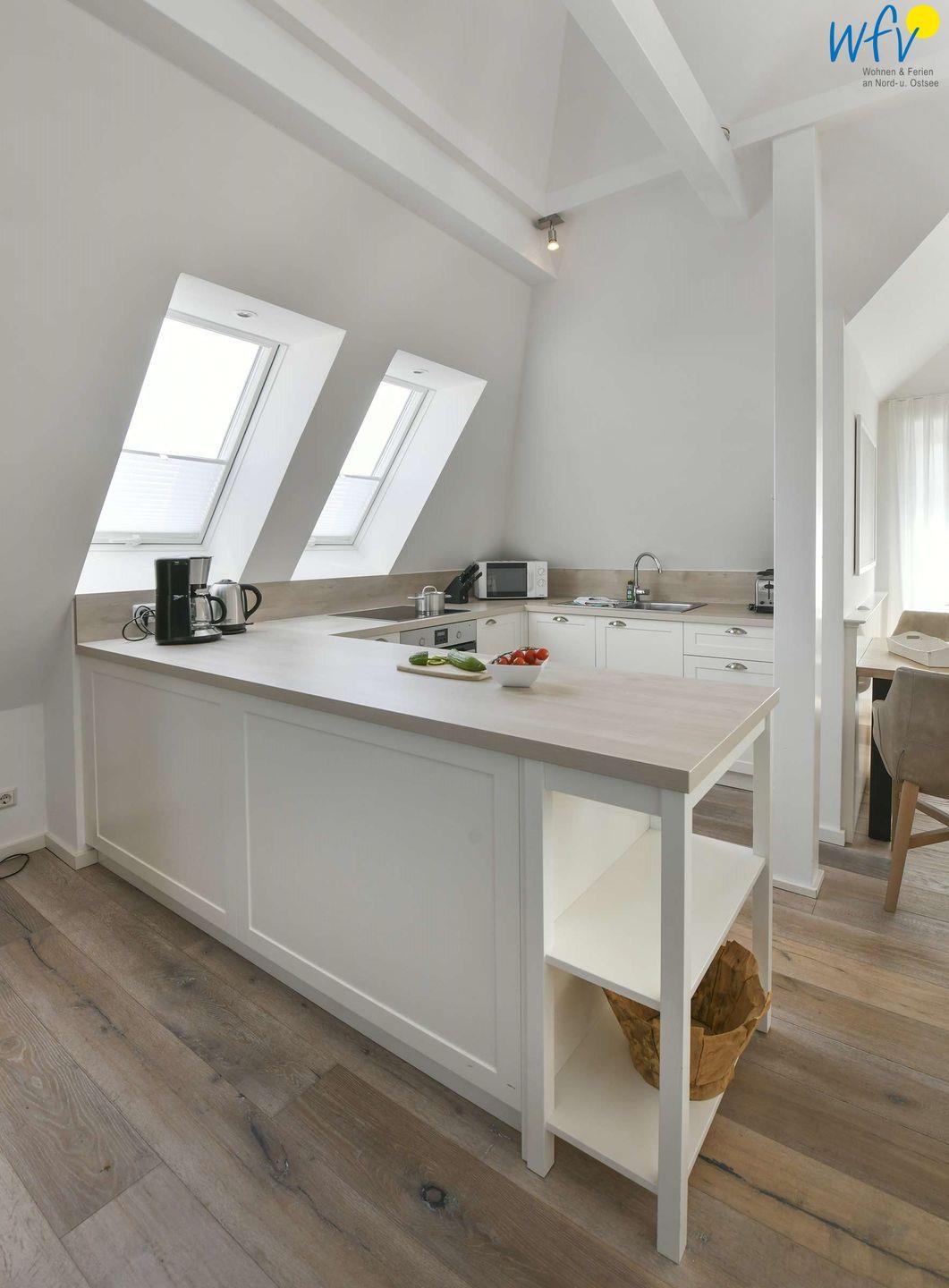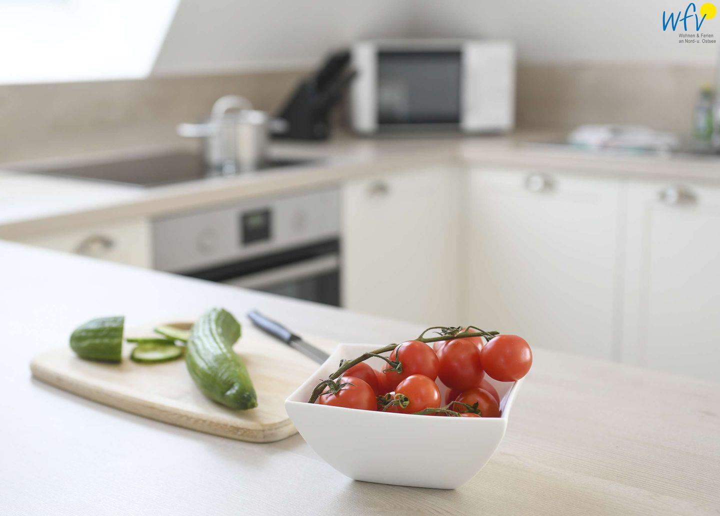 Sie kochen aus Leidenschaft? Oder wünschen sich eine bequeme Selbstverpflegung in Ihrem Urlaub auf Wangerooge? Die integrierte Küche verfügt über eine moderne Einbauküche (u.a. mit Herd/Backofen, Kühlschrank, Mikrowelle, Geschirrspüler sowie Kaffeemaschine, Toaster und Geschirr). Ein großer Esstisch lädt zu gemeinsamen Mahlzeiten und lustigen Spieleabenden ein.