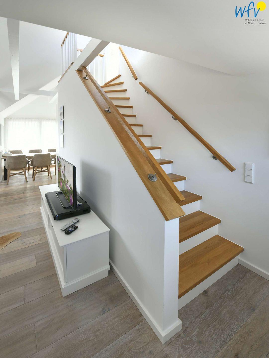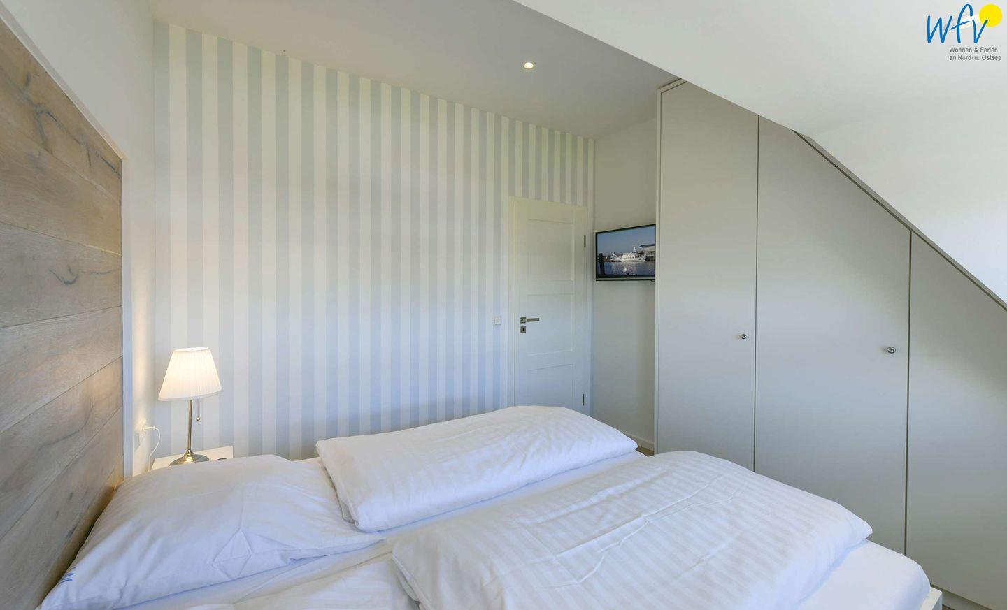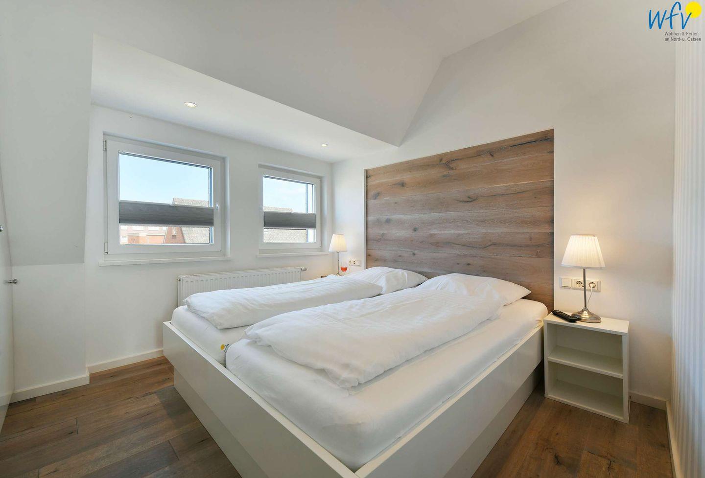 Wenn es draußen dunkel wird, bieten die zwei komfortablen separaten Schlafzimmer eine angenehmen Nachtruhe. Das Schlafzimmer im Dachgeschoss ist mit einem Doppelbett ausgestattet, das Zimmer im kuscheligen Spitzboden mit zwei Einzelbetten. In beiden Schlafzimmern können Sie Filme zum Einschlafen schauen. Hochwertige Plissees sorgen für eine angenehme Verdunkelung.