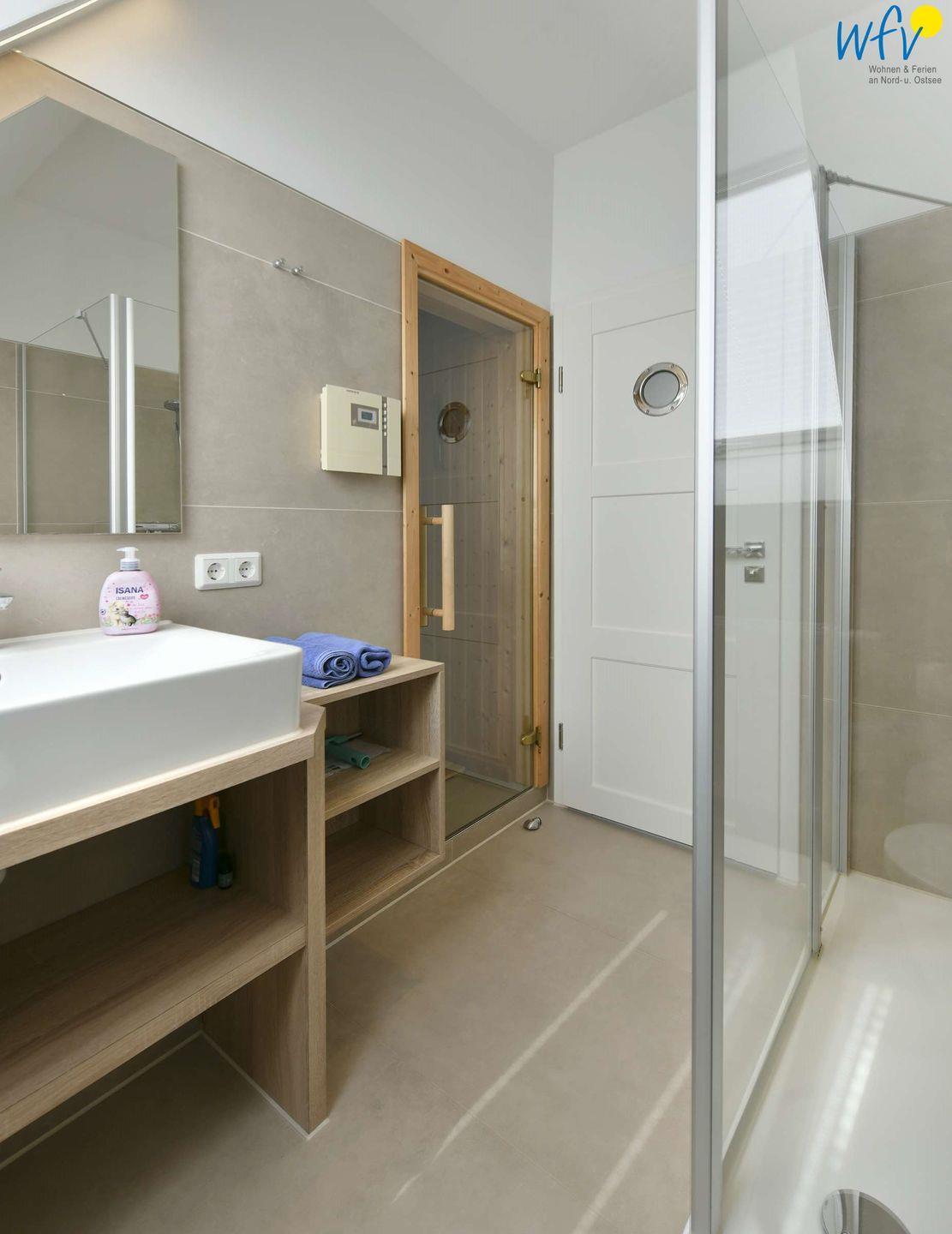 Auch an kühleren Tagen verwöhnt Sie diese Ferienwohnung auf Wangerooge mit Wohlfühlmomenten: Heiße Aufgüsse in der eigenen Sauna sind ein traumhaftes Wellnessprogramm für Ihren Körper und Luxus für die Seele! Bademäntel stellen wir Ihnen gerne bei der Buchung der Wäschepakete bereit.