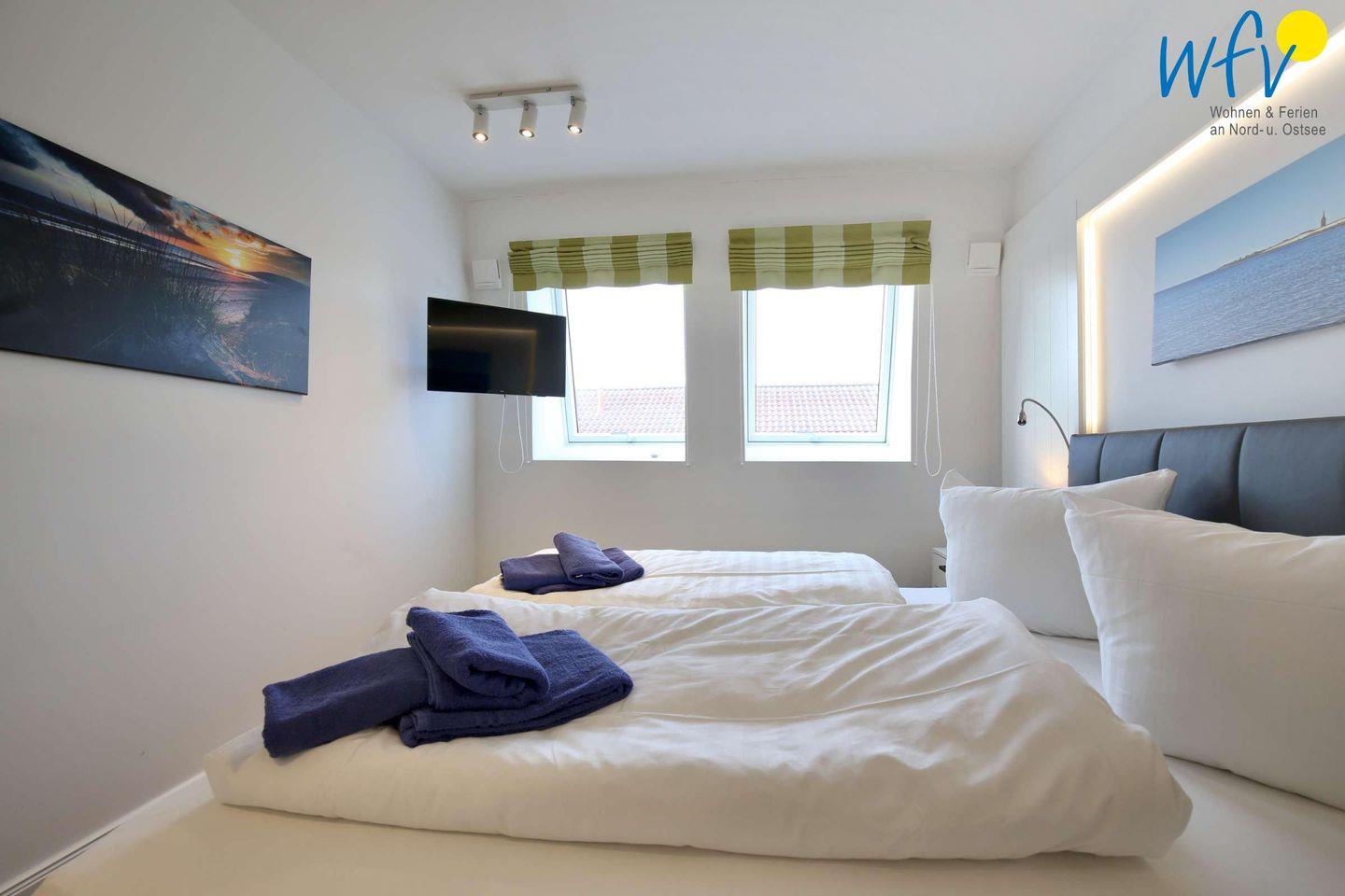 Das Schlafzimmer ist mit einem hochwertigen Boxspringbett für zwei Personen und einem TV ausgestattet, verfügt über Dachflächenfenster mit Beschattungsmöglichkeit per Fernbedienung und bietet mit einem großen Kleiderschrank genügend Platz - auch für längere Aufenthalte auf der Insel. Zwei weitere Schlafmöglichkeiten finden sich auf der gemütlichen Schlafcouch im Wohnzimmer. Bei Bedarf kann auf Anfrage noch ein Zustellbett in die Wohnung gestellt werden.