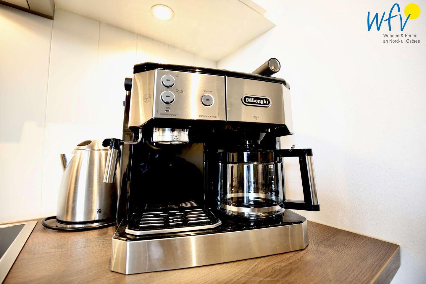 Der helle, offene Wohn-Ess-Bereich mit Zugang zum Balkon und die Küche mit moderner Ausstattung (u.a. mit Herd, Backofen, Spülmaschine, edlem Geschirr, Gläsern und Karaffen sowie diversen Kleingeräten wie Kaffee-/ Espressomaschine, Saftpresse oder Milchaufschäumer) ermöglicht es Ihnen, auch im Urlaub bequem zu kochen und lange Abende am großen Küchentisch gemeinsam zu genießen.
