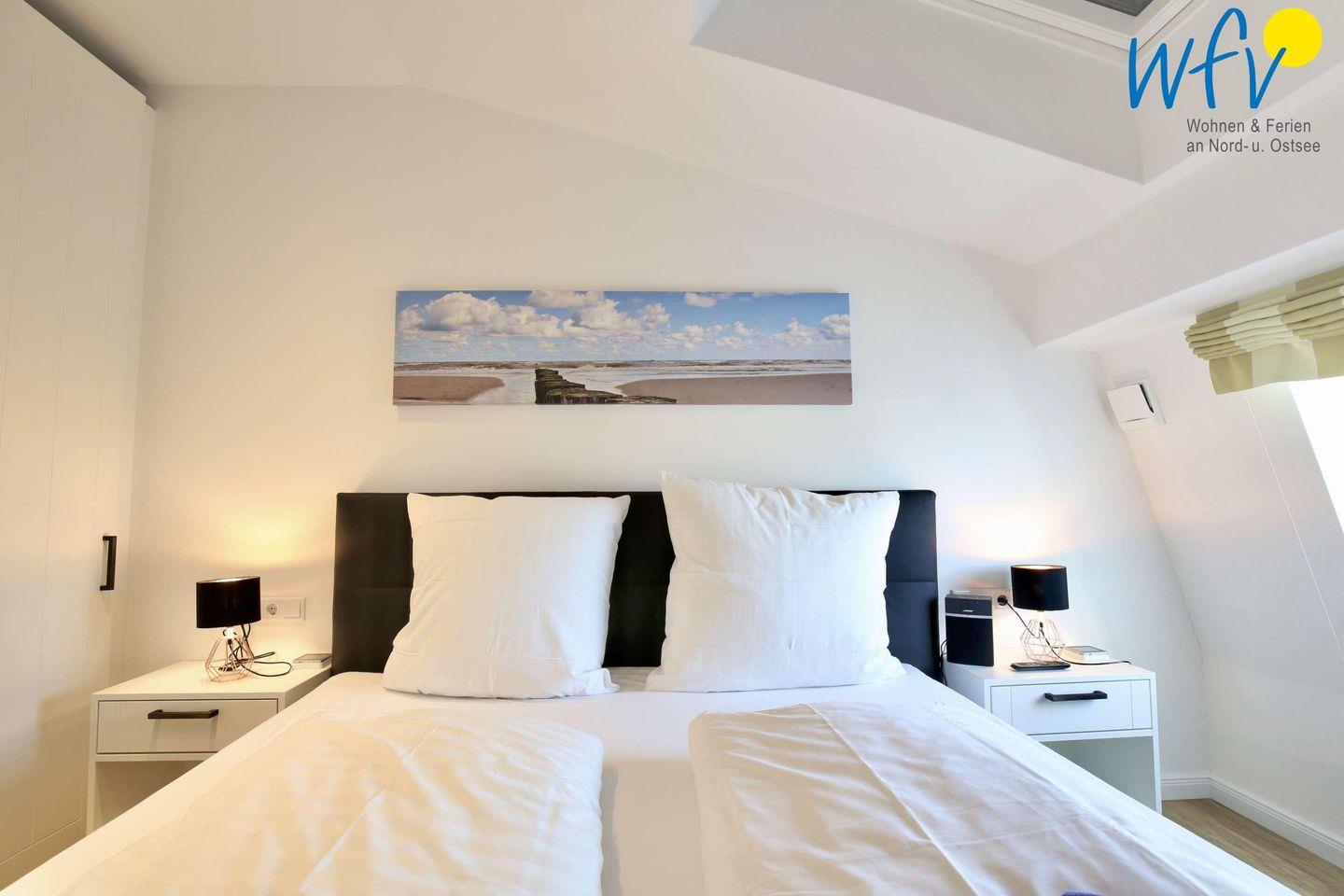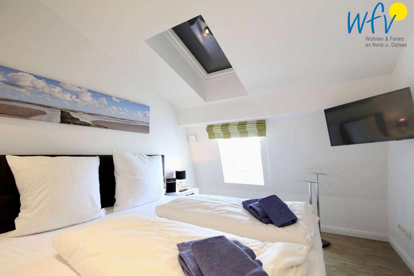 Das separate Schlafzimmer ist mit einem hochwertigen Boxspringbett für zwei Personen sowie einem TV-Gerät ausgestattet, verfügt über Dachflächenfenster mit Beschattungsmöglichkeit per Fernbedienung und bietet mit einem großen Kleiderschrank genügend Platz - auch für längere Aufenthalte auf der Insel. Zwei weitere Schlafmöglichkeiten finden sich auf der gemütlichen Schlafcouch im Wohnzimmer. Bei Bedarf kann auf Anfrage noch ein Zustellbett in die Wohnung gestellt werden.