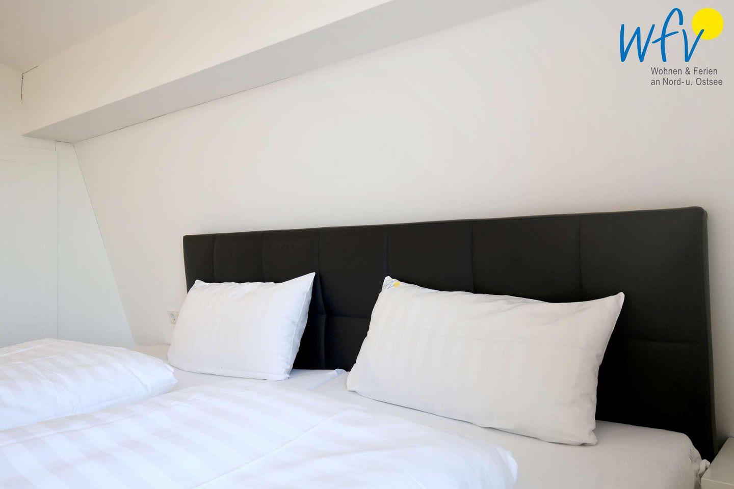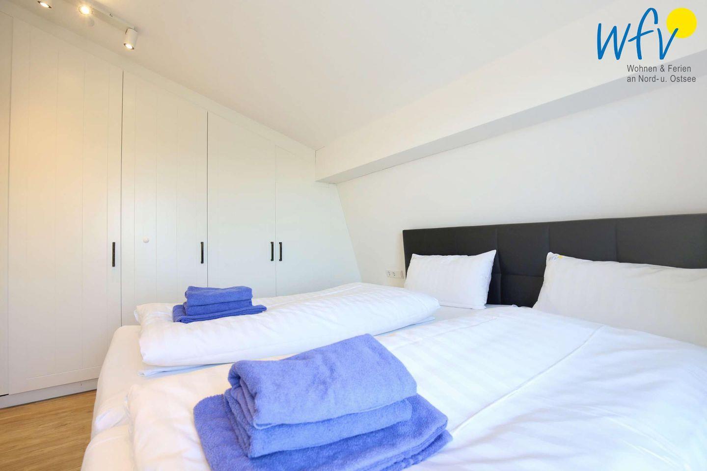Die moderne Einrichtung setzt sich im separaten Schlafzimmer der Ferienwohnung fort. Es verfügt über ein großes hochwertiges Boxspringbett für zwei Personen und einen geräumigen Kleiderschrank, welcher auch längere Aufenthalte in unserem Quartier Nummer 12 angenehm gestaltet. Das große Fenster bietet einen schönen Lichteinfall und darüber hinaus einen wunderschönen Blick nach draußen. Selbstverständlich bestehen Verdunkelungsmöglichkeiten.