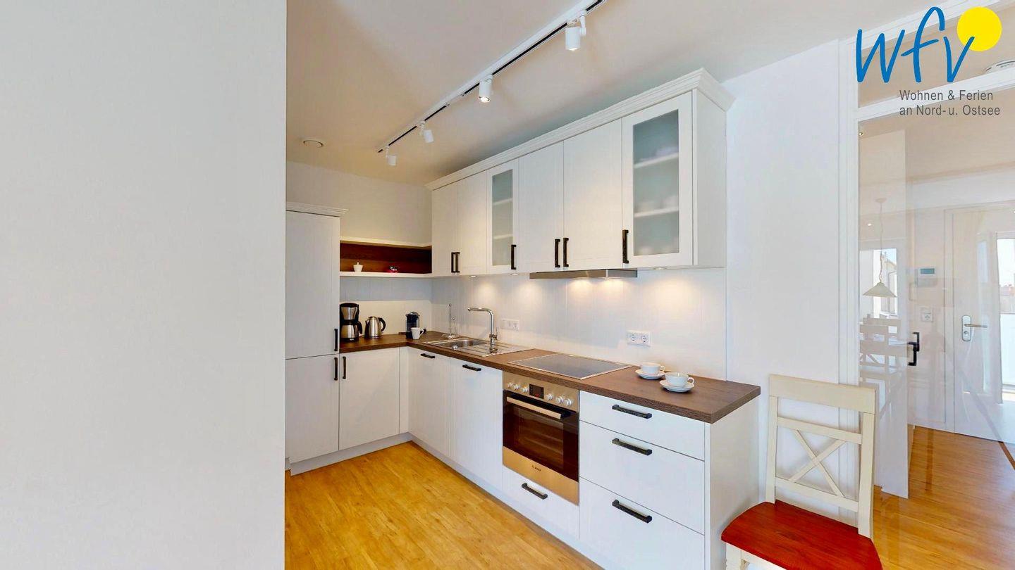 In der voll ausgestatteten Küche (u.a. mit Herd, Backofen, Spülmaschine sowie diversen Kleingeräten) lassen sich bequem leckere Gerichte zaubern. Ein großer Esstisch ist ebenfalls vorhanden.