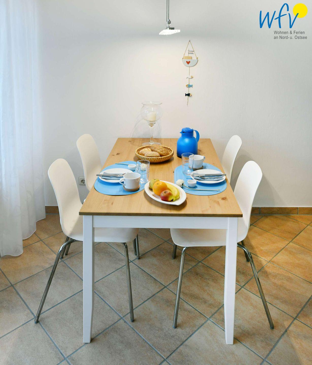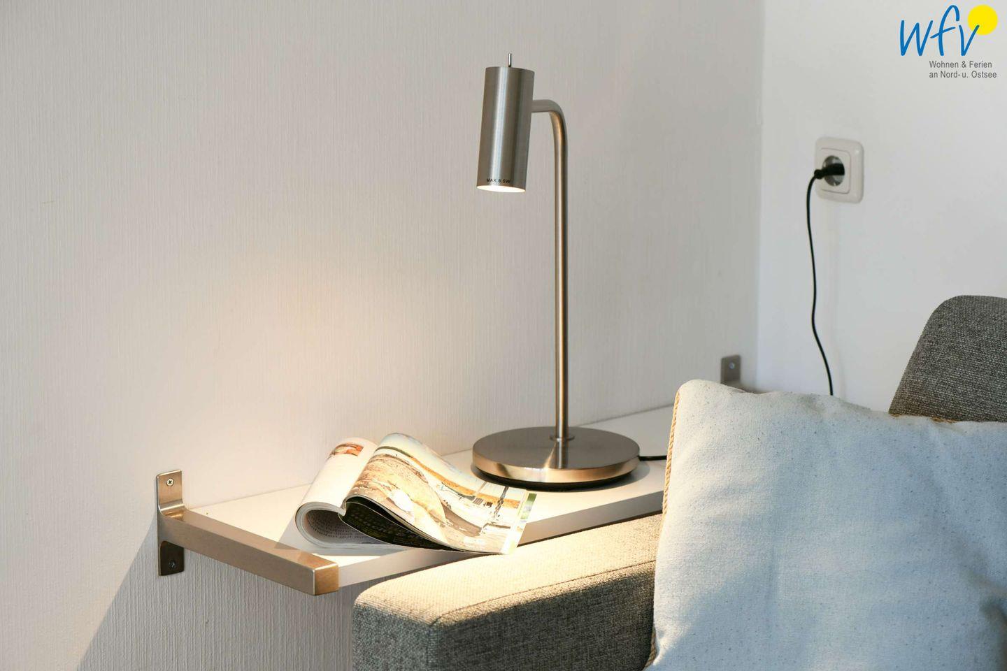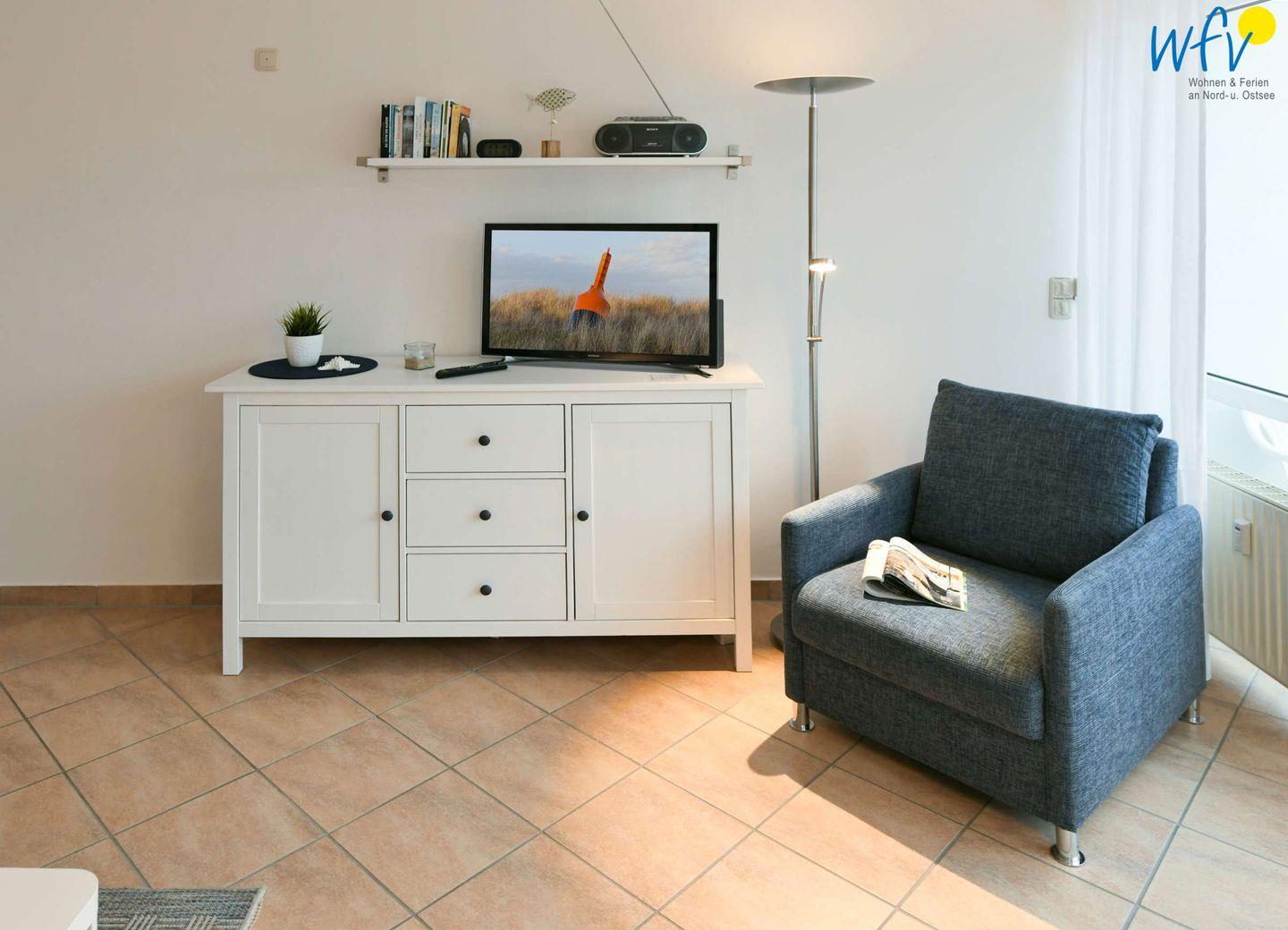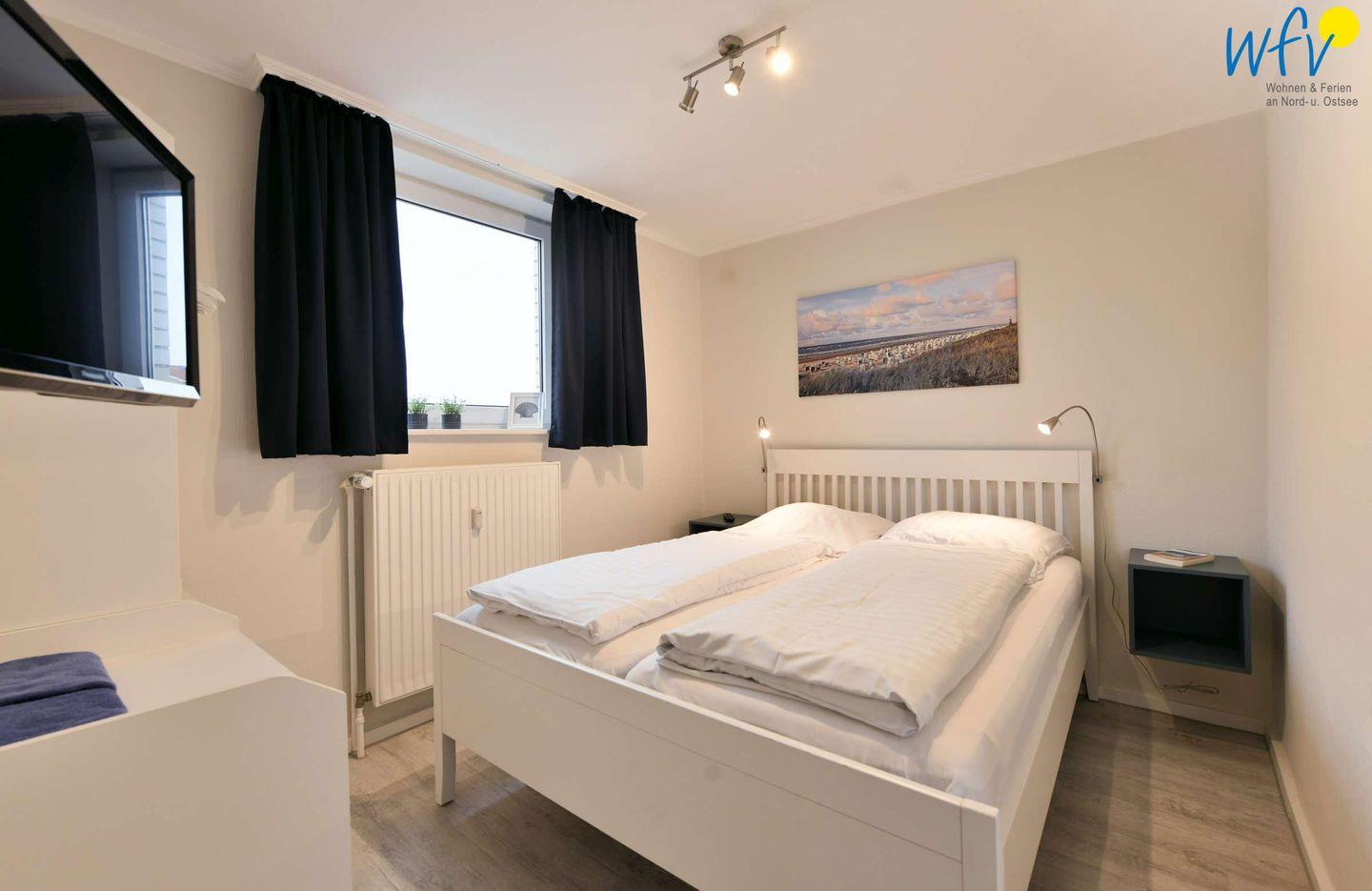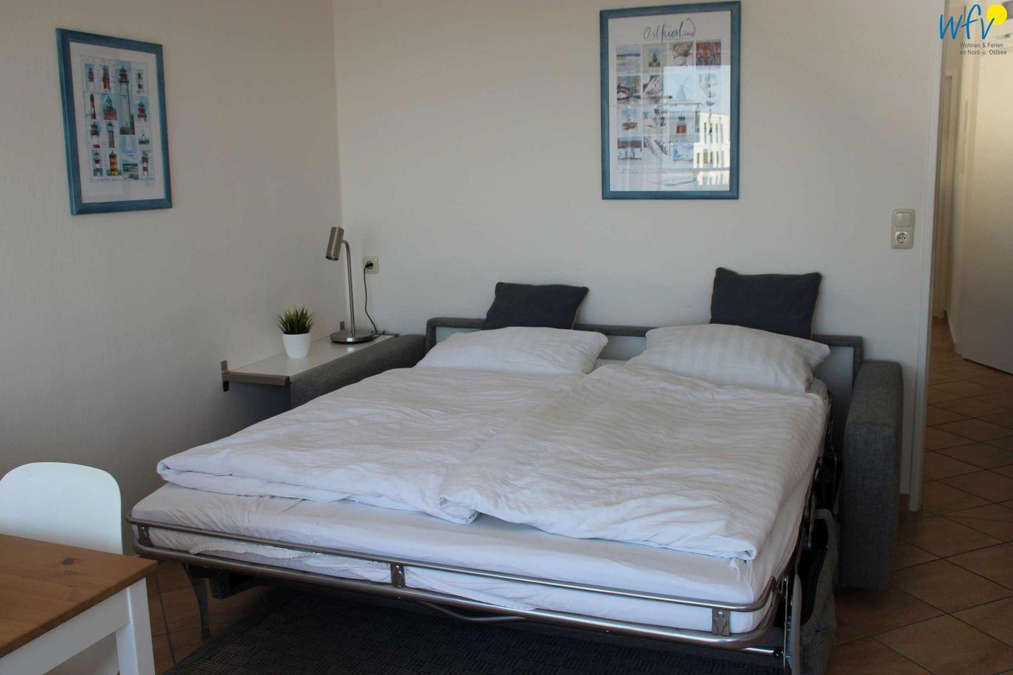 Wenn auf Wangerooge die Sonne untergeht, wartet in dem separaten Schlafzimmer ein komfortables Doppelbett auf Sie. Zwei weitere Personen finden auf der Schlafcouch im Wohnzimmer Platz (Liegefläche 1,60 m x 2 m). Für unsere kleinen Gäste gibt es ein Kinderbett.