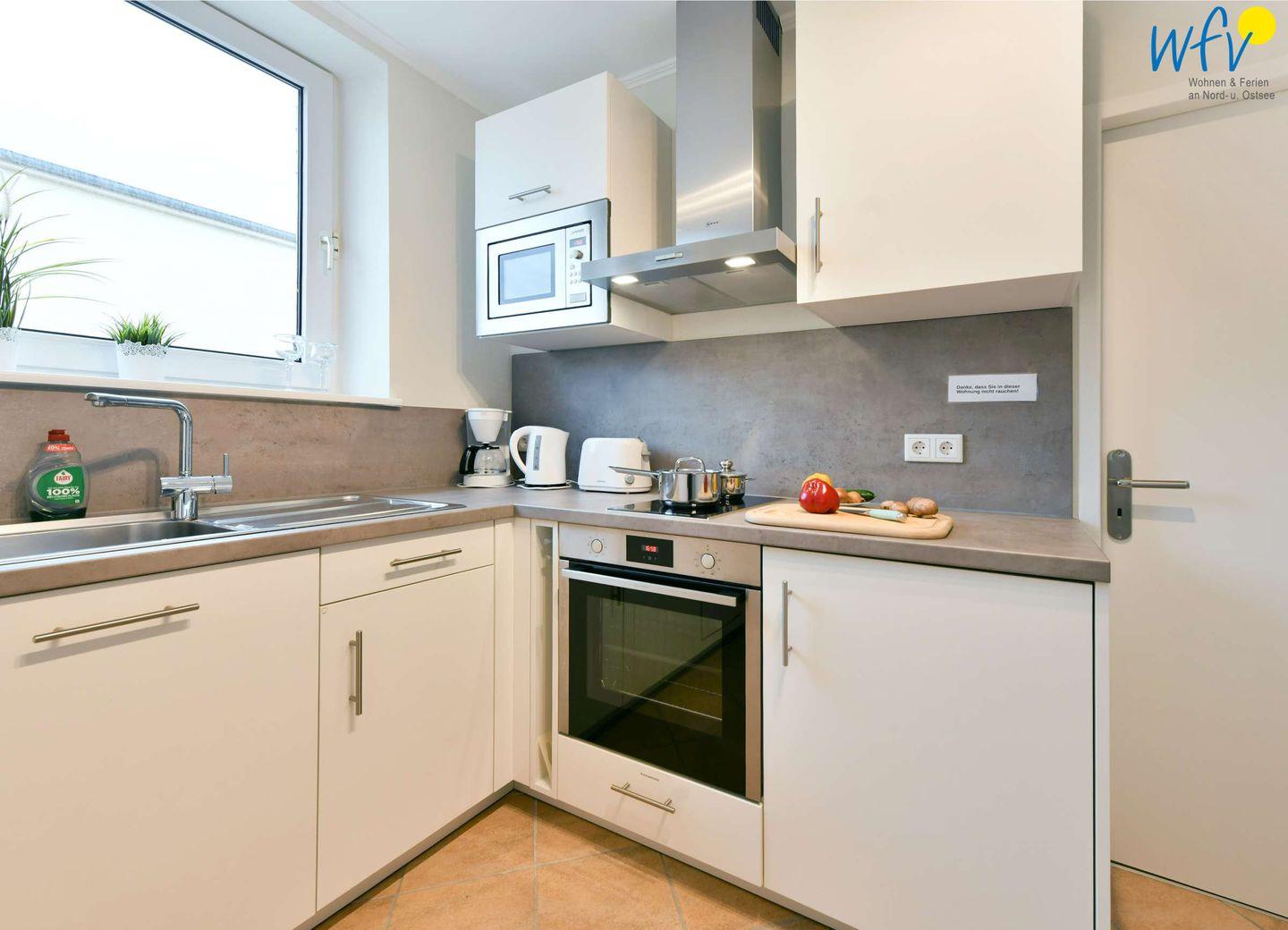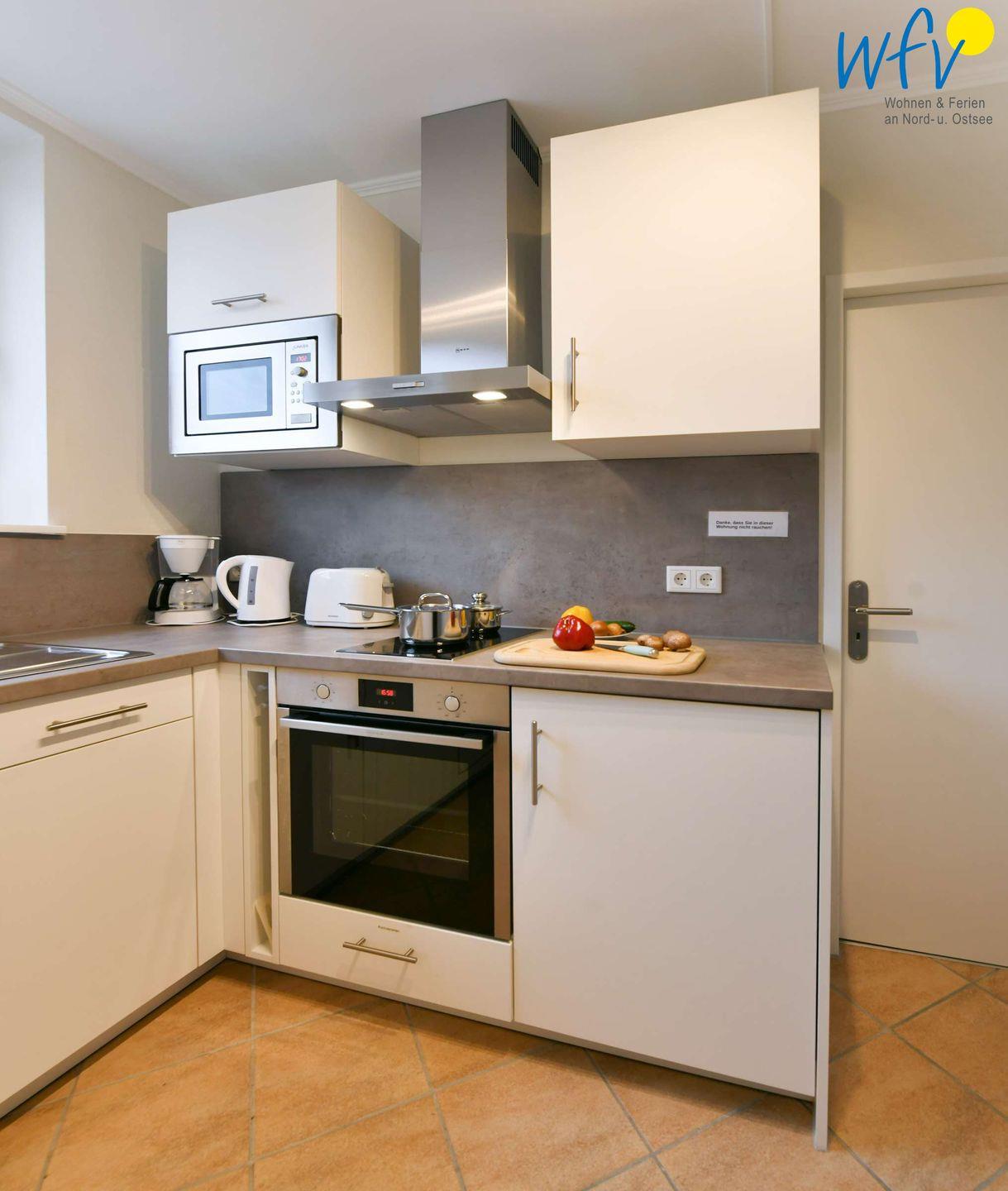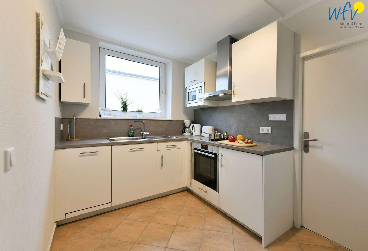 Für eine bequeme Selbstverpflegung ist die moderne Küche u.a. mit einem 2-Plattenherd, einem Backofen, einer Mikrowelle und einer Spülmaschine ausgestattet.