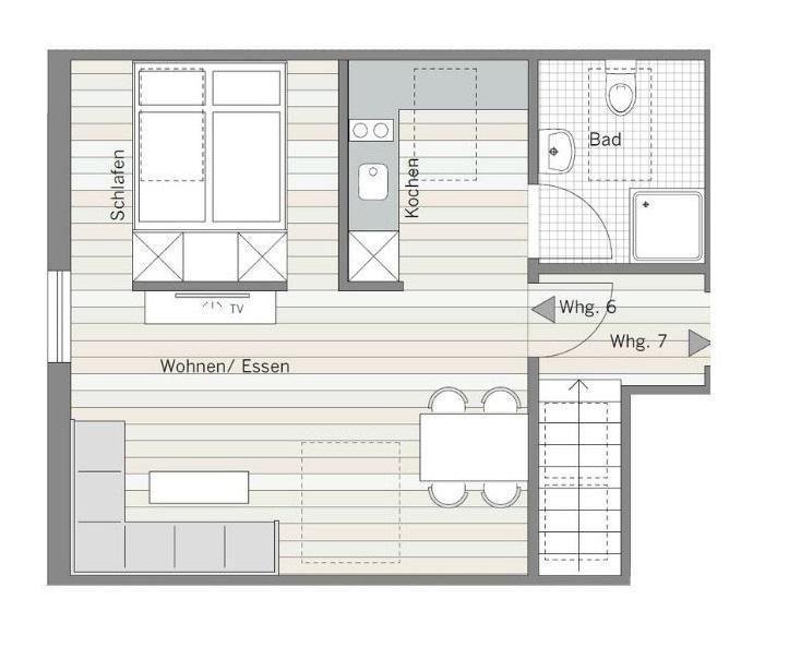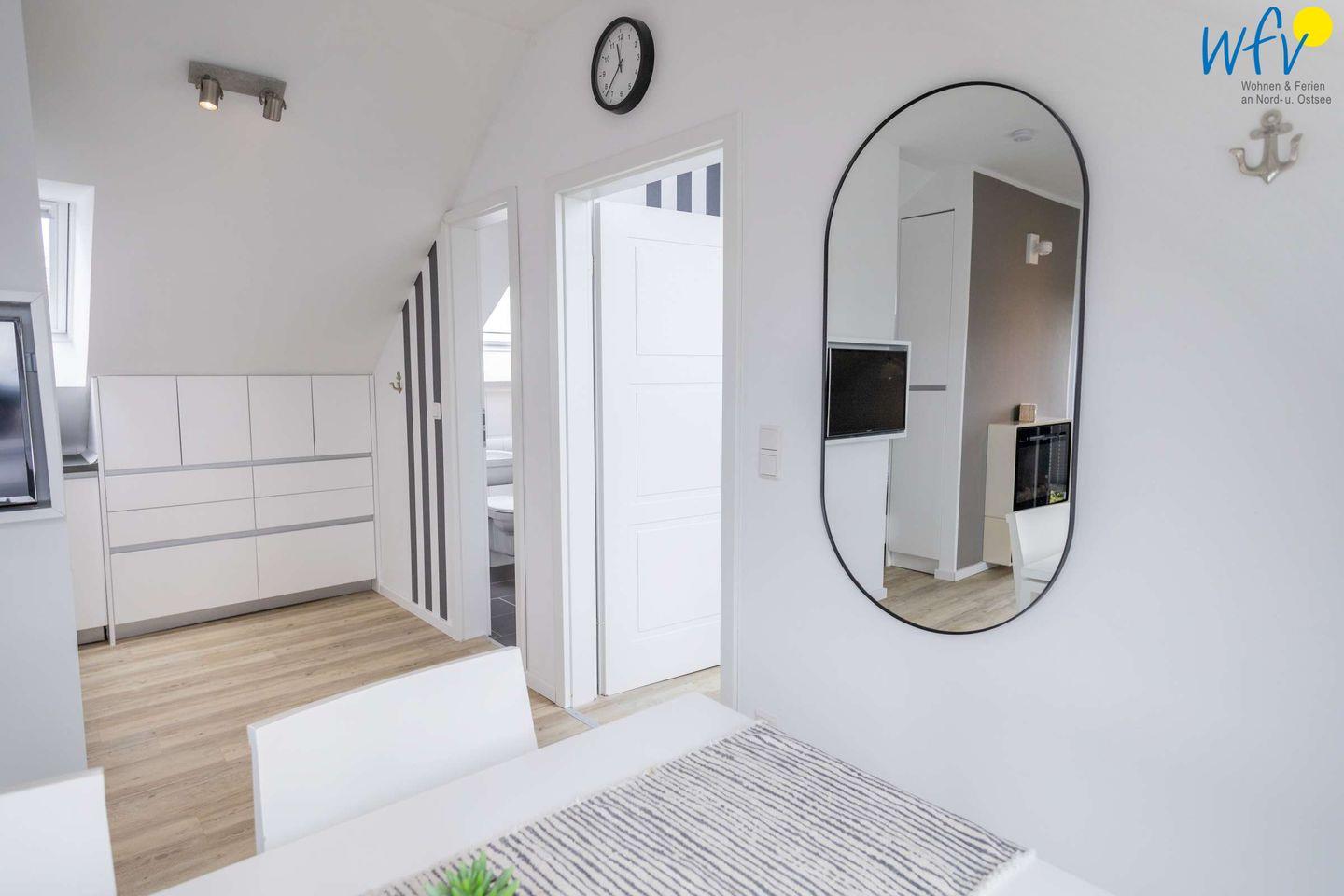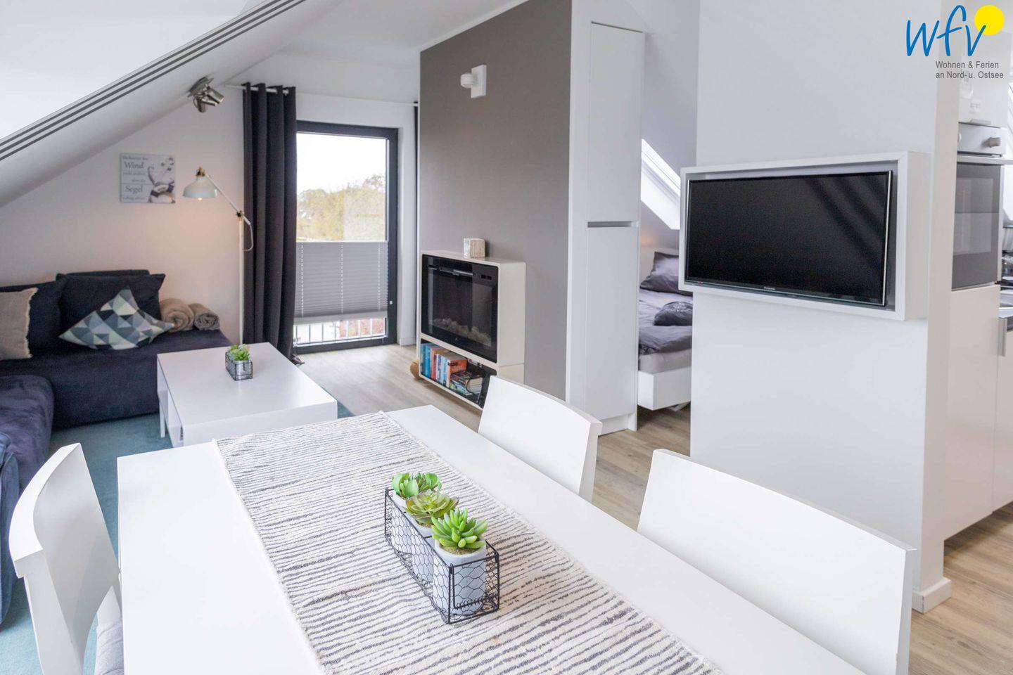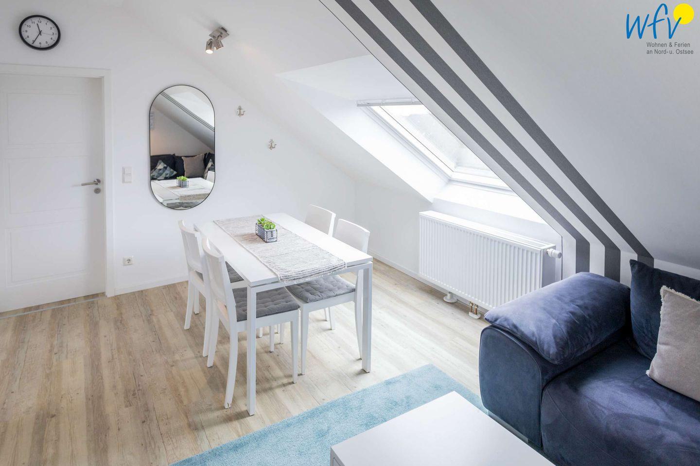 Die Wohnung 6 befindet sich im Dachgeschoss und verfügt über einen großzügigen Wohnraum mit Couchecke und Doppelbett sowie über eine offene Küche mit Esstisch und ein Duschbad.