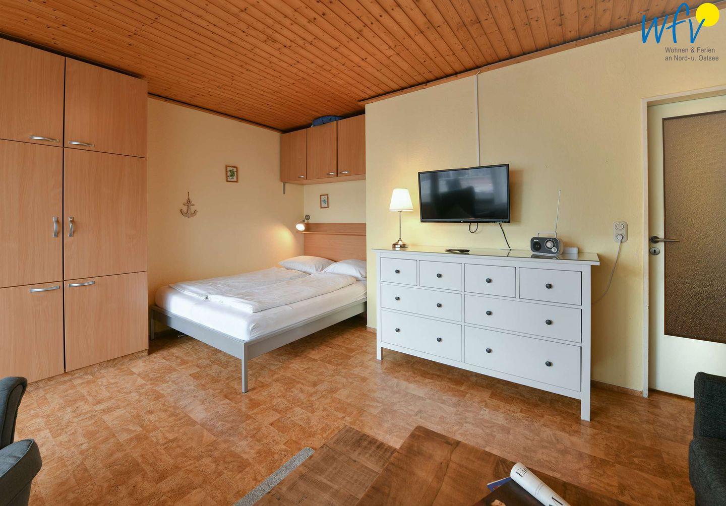 Schlafmöglichkeiten für zwei Personen bestehen durch ein Doppelbett (1,70 m). Zudem gehört ein Kinderbett zum festen Inventar. Ihre Urlaubsgarderobe findet im Kleiderschrank Platz.