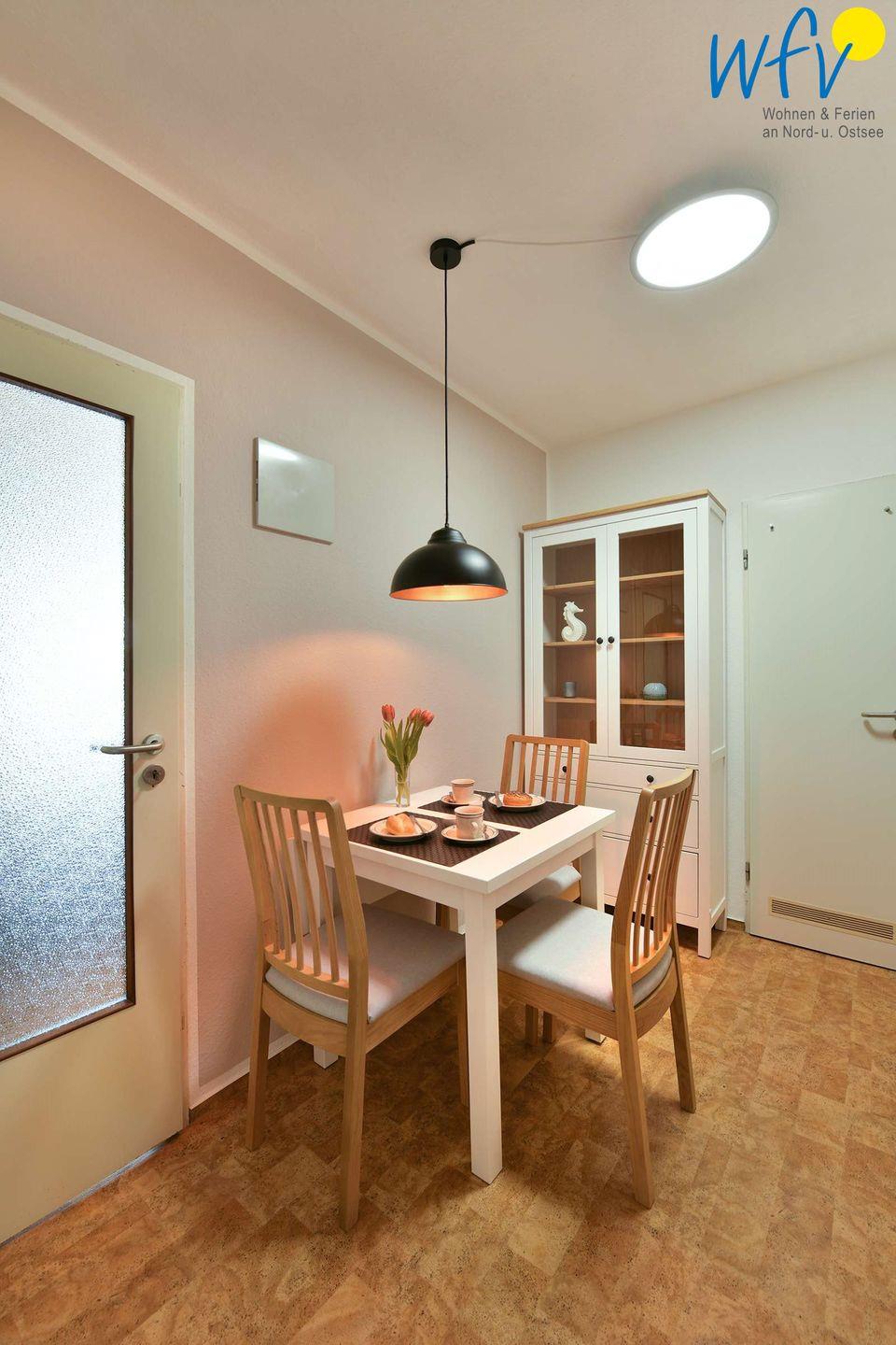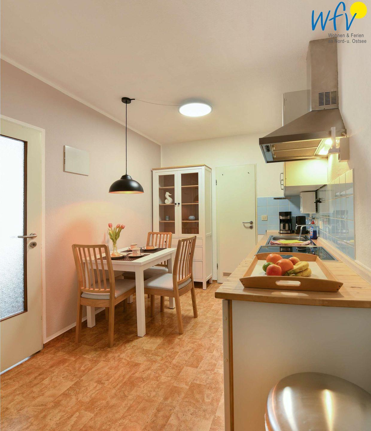 Damit Sie sich in Ihrem Wangerooge-Urlaub bequem selbst verpflegen können, ist die Ferienwohnung mit einer separaten Küche und einem kleinen Essbereich ausgestattet. Es stehen Ihnen u.a. ein Ceranherd mit Backofen und ein Kühlschrank mit Gefrierfach zur Verfügung sowie diverse Kleingeräte (Kaffeemaschine, French Press, Wasserkocher, Toaster).
