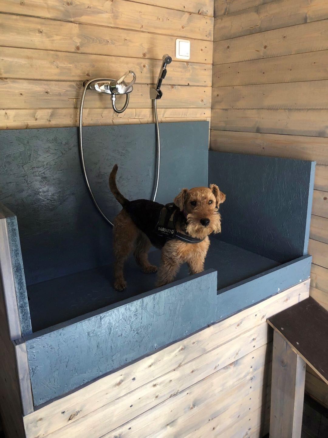 Ab sofort. Luxus für Hund und Halter, Häuschen im Außenbereich mit einer Warmwasser- Hundedusche, mit Rampe und erhöhtem Waschtisch.