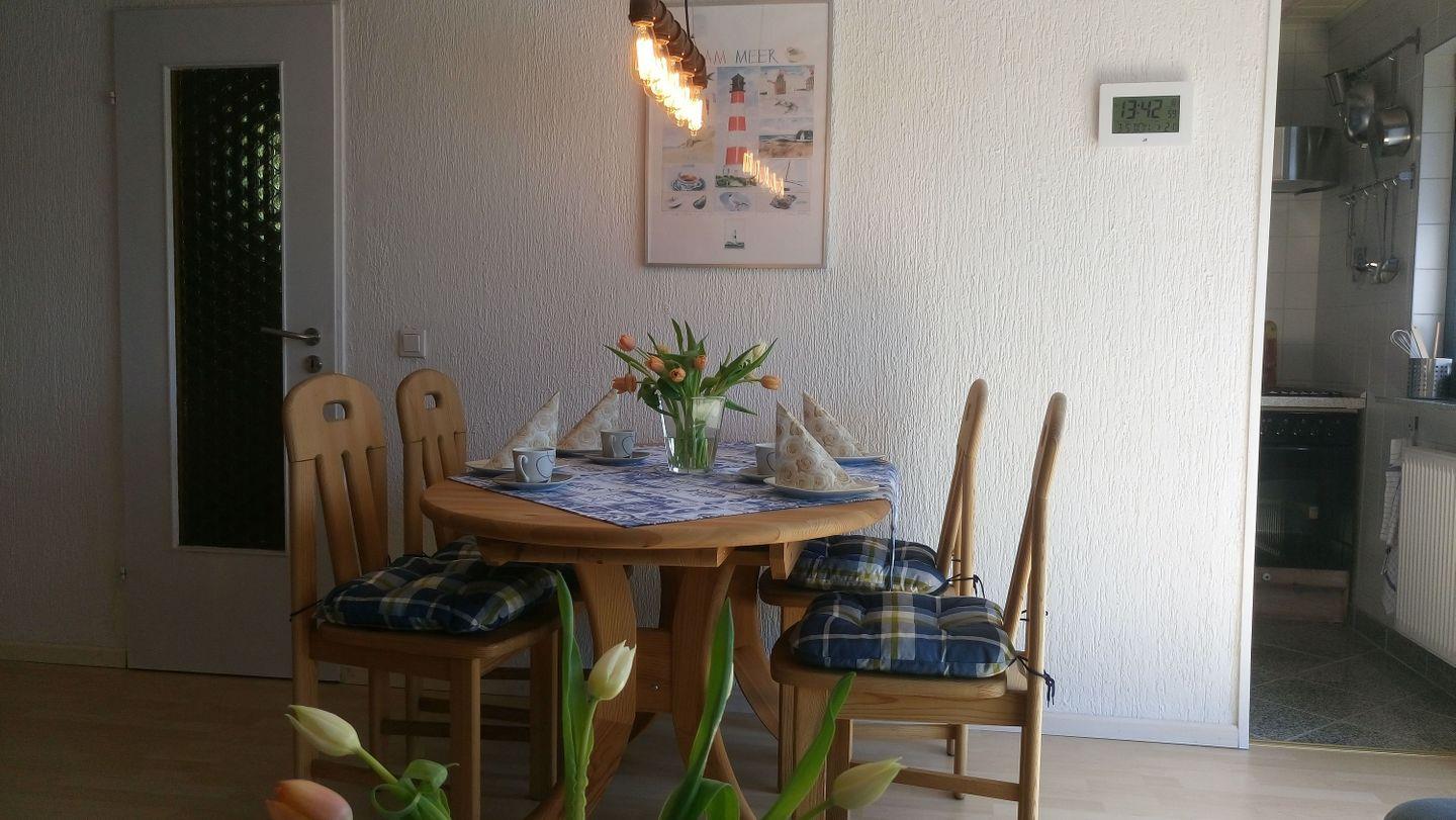 eingerichtet. Ein großer Esstisch steht bereit, an dem sie Ihre Mahlzeiten zu sich nehmen können.