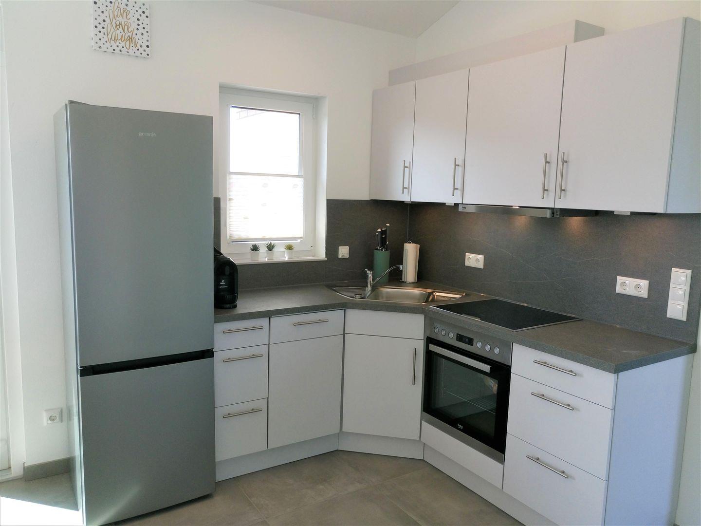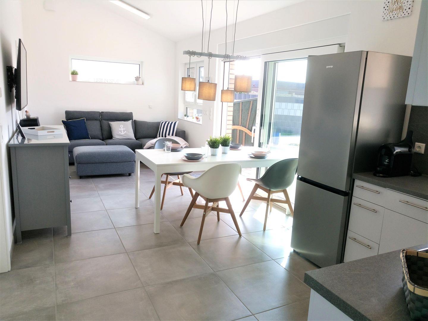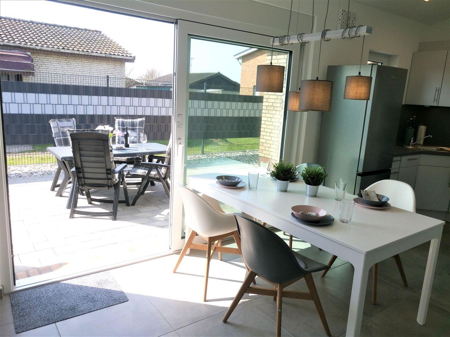 Von der Terrasse kommen Sie in den geräumigen, hellen Wohnraum, dort können Sie sich die Zeit bei einem guten Buch oder einem spannenden Film vertreiben. Der Esstisch lädt dazu ein, sich mit Köstlichkeiten aus der Region zu verwöhnen, die Sie sich in der modernen Küchenzeile zubereitet haben. Backofen, Geschirrspüler, Mikrowelle, eine Cafissimo- Kapsel Maschine, Filterkaffeemaschine und vieles mehr steht Ihnen hier zur Verfügung. Fußbodenheizung und Außenjalousien im gesamten Haus.