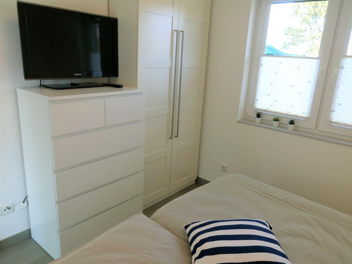 Das Haus verfügt über 2 Schlafzimmer. Eines mit einem Doppelbett und TV-Gerät und das andere mit 2 Einzelbetten. Ein Babyreisebett kann nur in dem Schlafzimmer mit den Einzelbetten aufgestellt werden. Selbstverständlich gibt es auch genügend Platz für Ihre Garderobe.