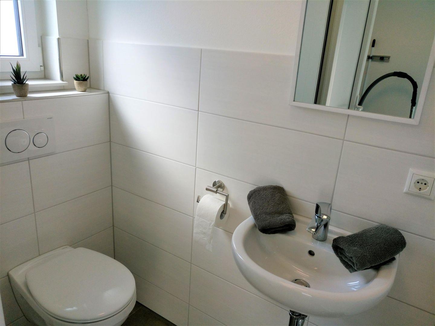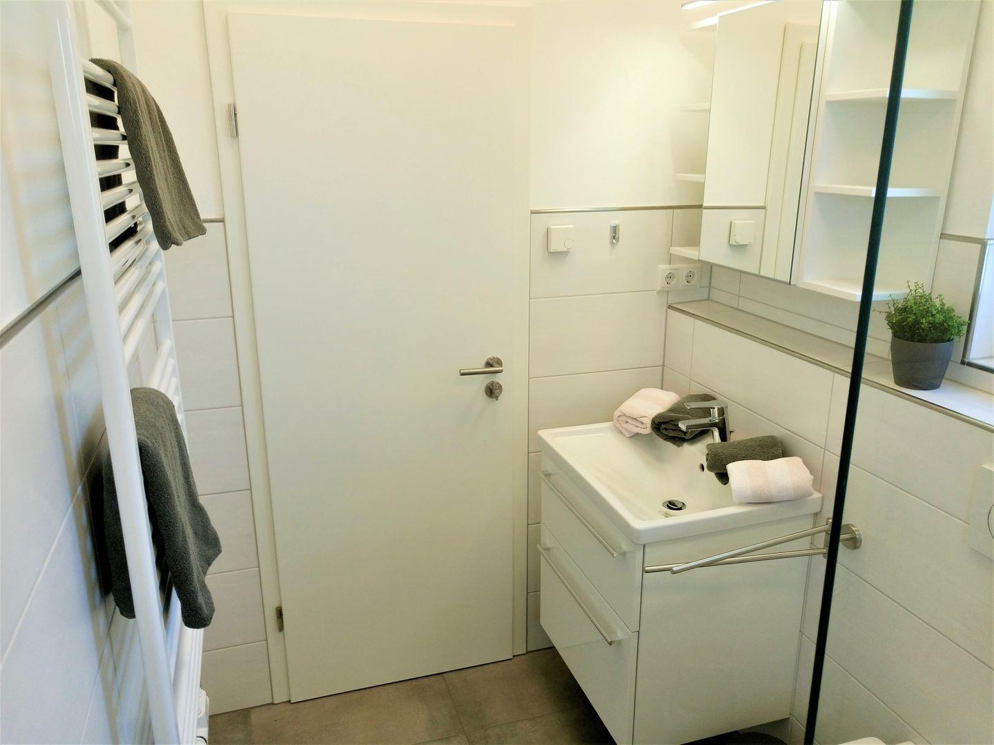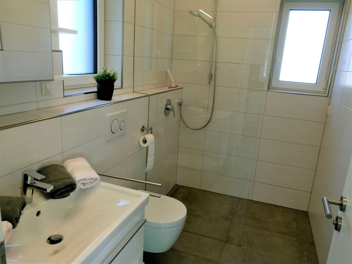 Ein schickes Tageslicht- Bad mit ebenerdiger Dusche und Handtuchwärmer, sowie ein Gäste WC gehören ebenfalls zur Ausstattung.