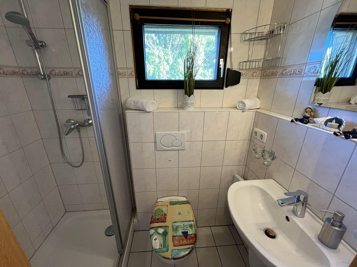 Das kleine Badezimmer mit Fenster verfügt über ein WC und eine Dusche (nicht ebenerdig).