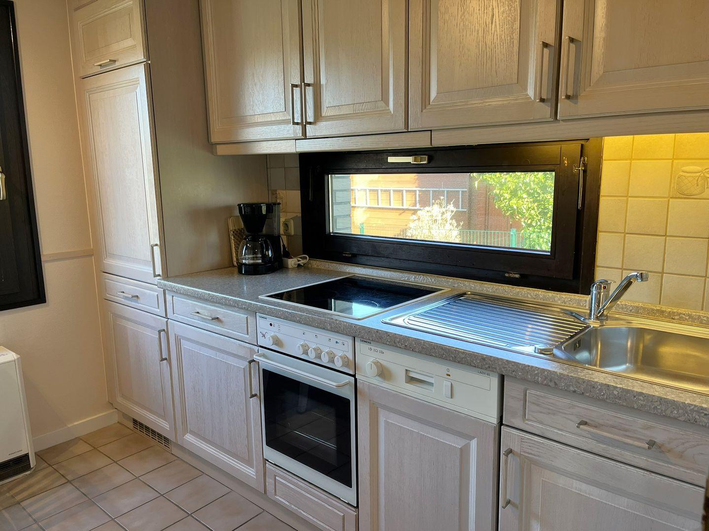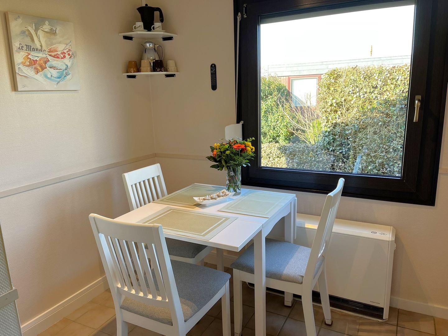 Die geschlossene Küche ist funktional ausgestattet und eignet sich gut für die Selbstversorgung: Ein Ceran-Herd, Backofen, Kühlschrank mit Gefrierfach, Spülmaschine, Kaffeemaschine, Wasserkocher und Toaster stehen Ihnen zur Verfügung. Der Esstisch schafft einen passenden Rahmen für gemeinsame Mahlzeiten oder einen Kaffee am Nachmittag. Fliegengitter unterstützen den Komfort an warmen Tagen.