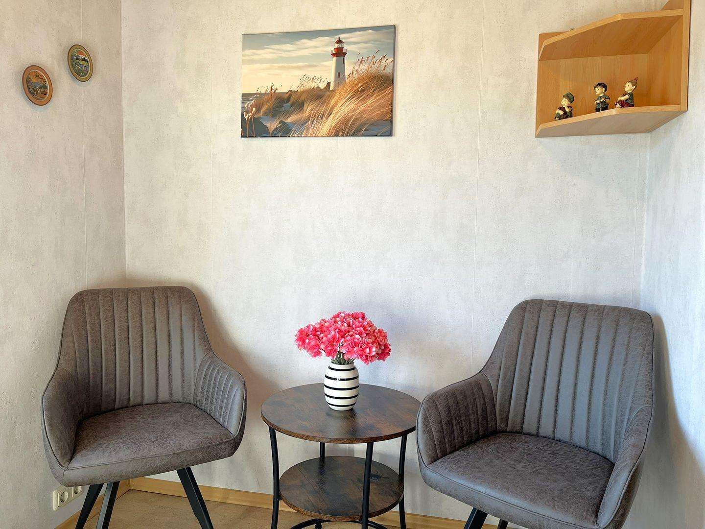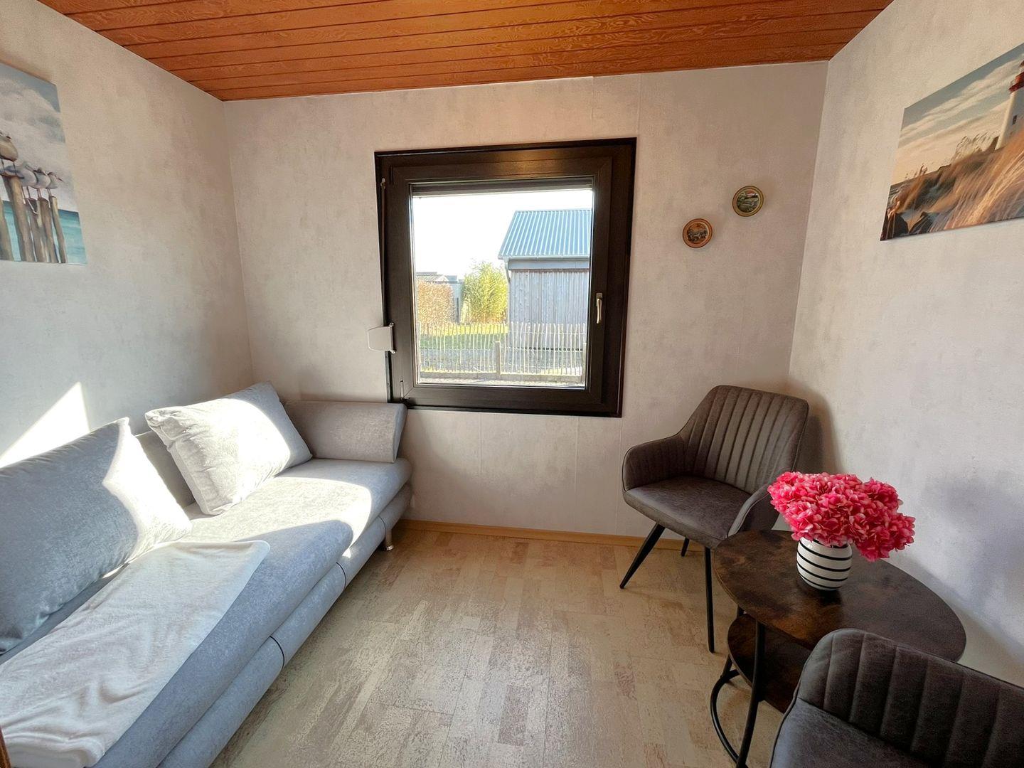 Im Wohnbereich erwartet Sie eine großzügige Wohnlandschaft und ein gemütlicher Sessel, TV und ein Radio. Vom diesem Raum gelangen Sie in den schönen Gartenbereich, der, mit seiner überdachten Terrasse die Möglichkeit bietet die Nordseeluft hautnah zu genießen, egal ob die Sonne scheint oder es auch mal etwas regnet.