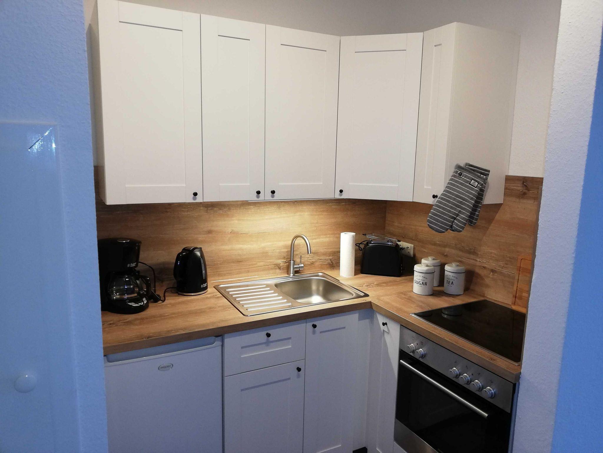 Die neue Küche ist sehr gut ausgestattet. Es steht unseren Gästen ein Herd, Backofen, Esstisch, Kaffeemaschine, Wasserkocher und ein Toaster zur Verfügung. Im Wohn- und Essbereich steht ein Smart-TV zur Verfügung.