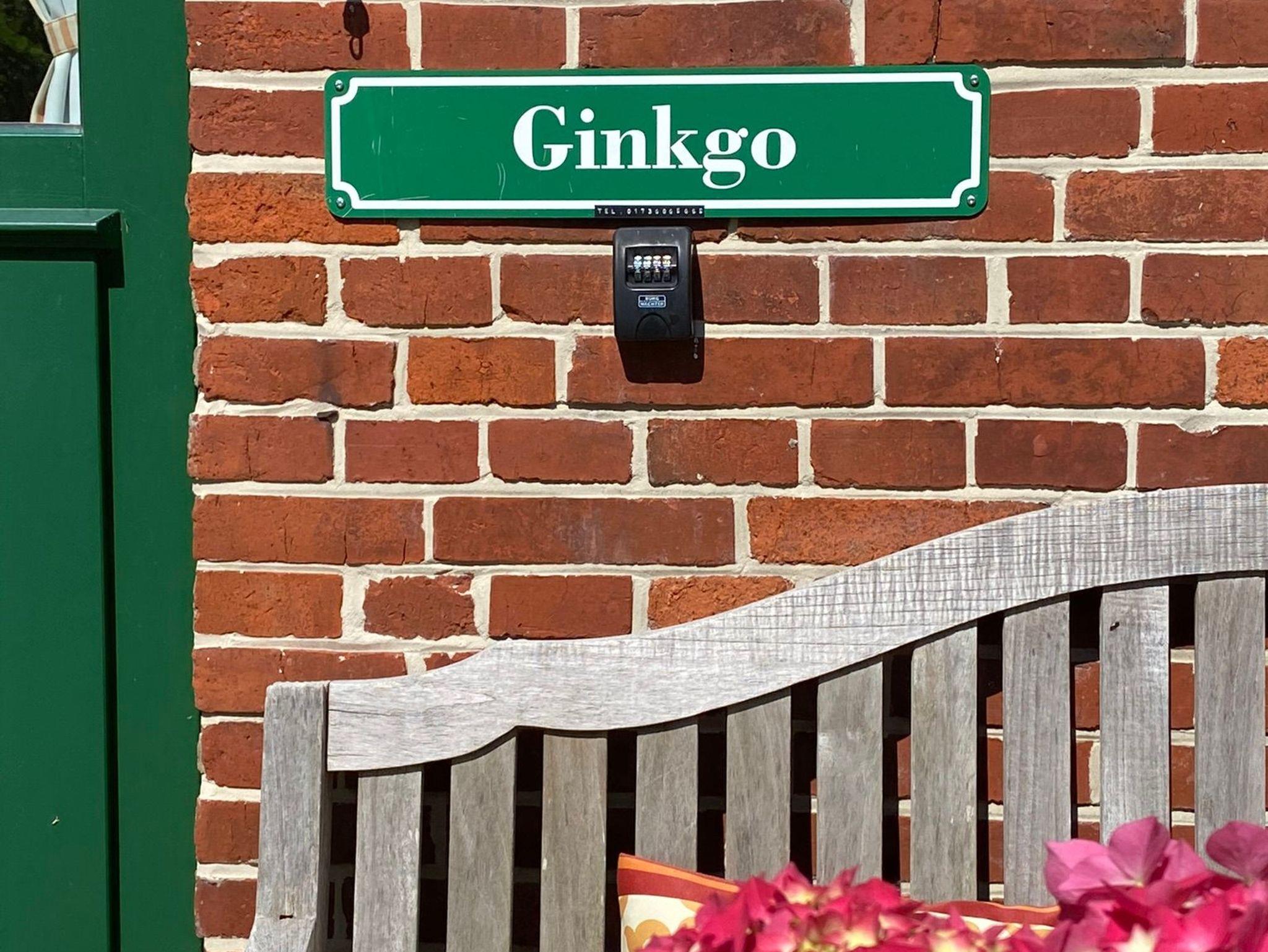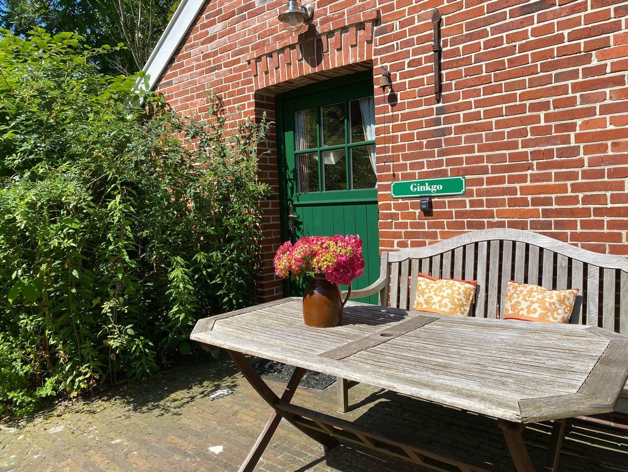 Eine Holzbank neben der Tür lädt mit Blick in den Garten zum Verweilen ein.