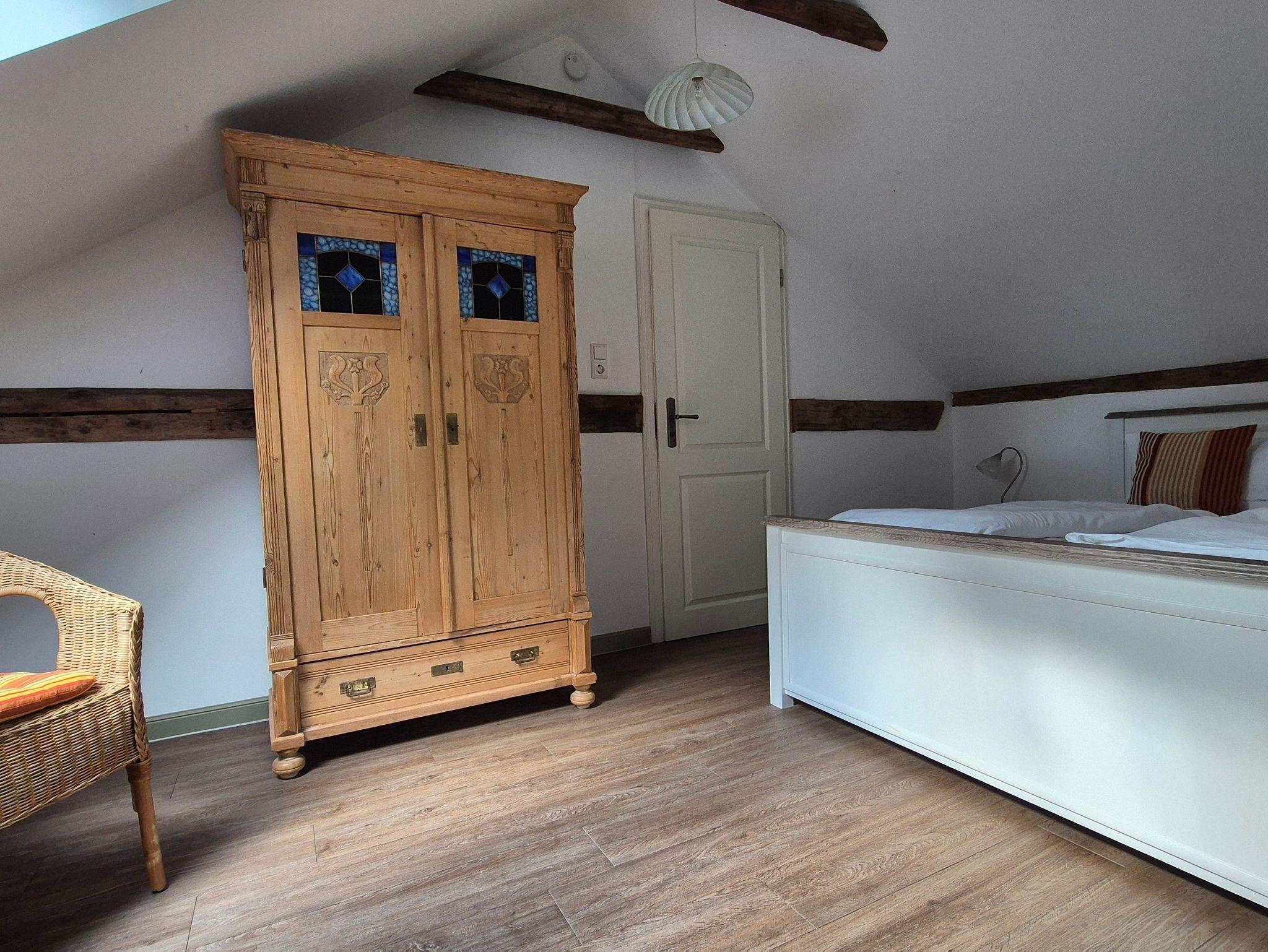 Die Ferienwohnung unterm Dach ist mit seinen Dachschrägen und der geschmackvollen Einrichtung besonders gemütlich. Die beiden Schlafzimmer der Ferienwohnung bieten für je 2 Personen Platz, auf der großen Schlafcouch im Wohnzimmer können 1-2 weitere Personen übernachten. Im großen Wohn-Esszimmer steht eine voll ausgestattete Küchenzeile mit Ceranfeld und Spülmaschine bereit.
