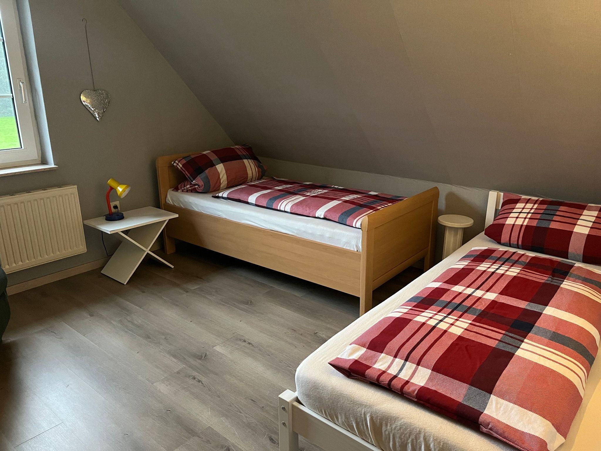 Unsere gemütliche Oberwohnung bietet Platz für bis zu 4 Personen. Über einen kleinen Eingangsbereich mit Garderobe und Spiegel geht es nach oben. Die Wohnung verfügt über 2 Schlafzimmer, Bad mit begehbarer Dusche sowie einen offenen Wohnbereich mit Küche. Die Dachterrasse lädt zum Sonnen und frühstücken ein. Im Garten bietet sich bestimmt ein schattiges Plätzchen zum Entspannen, spielen und grillen. Fahrräder können in einem abschließbaren Schuppen untergestellt werden. Eine Möglichkeit zum Laden von E-Bikeakkus ist vorhanden.