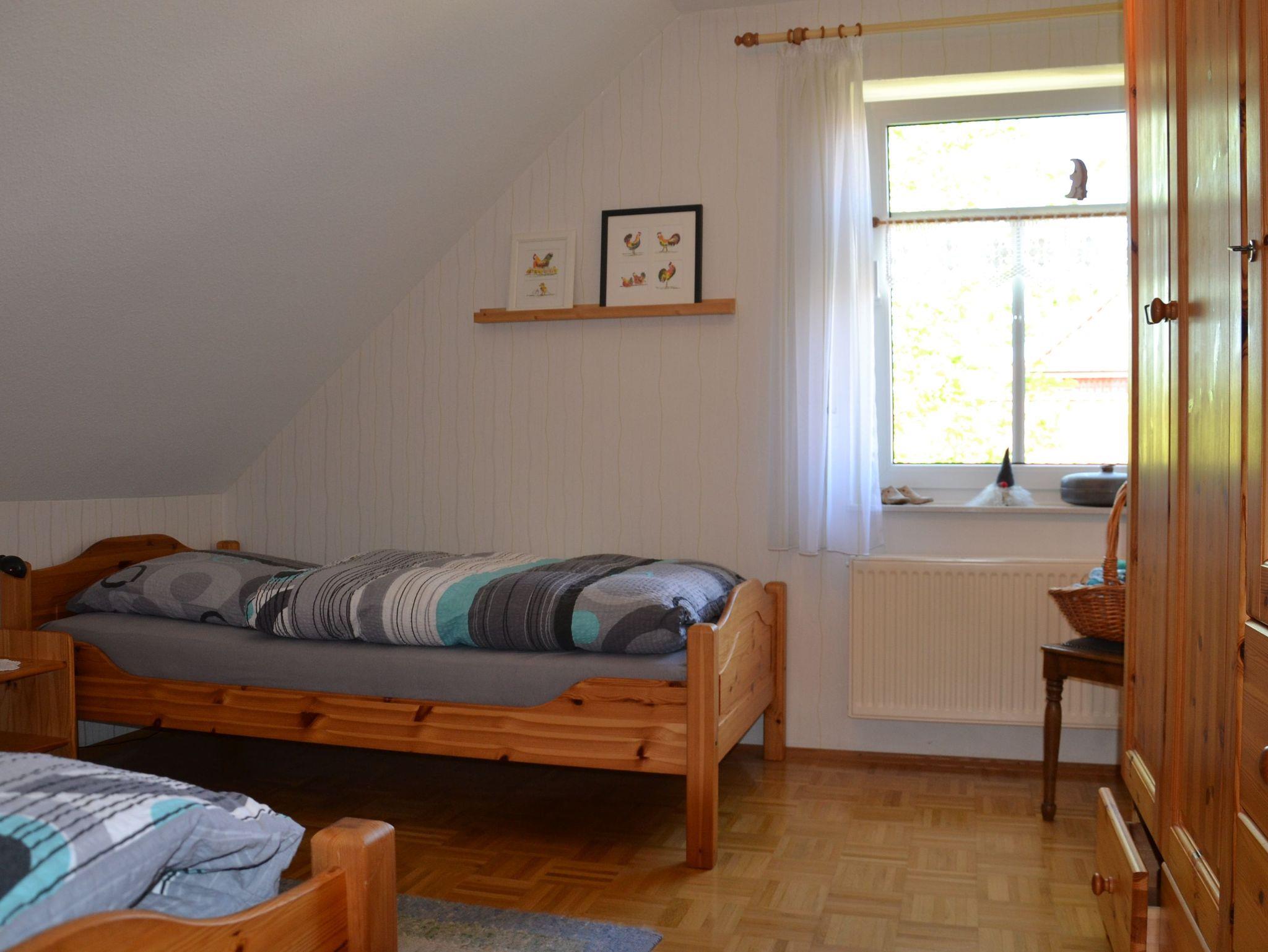 Helles Zimmer mit Doppelbett, 2 Nachttischen und Kleiderschrank. Das zweite Zimmer mit zwei Einzelbetten.