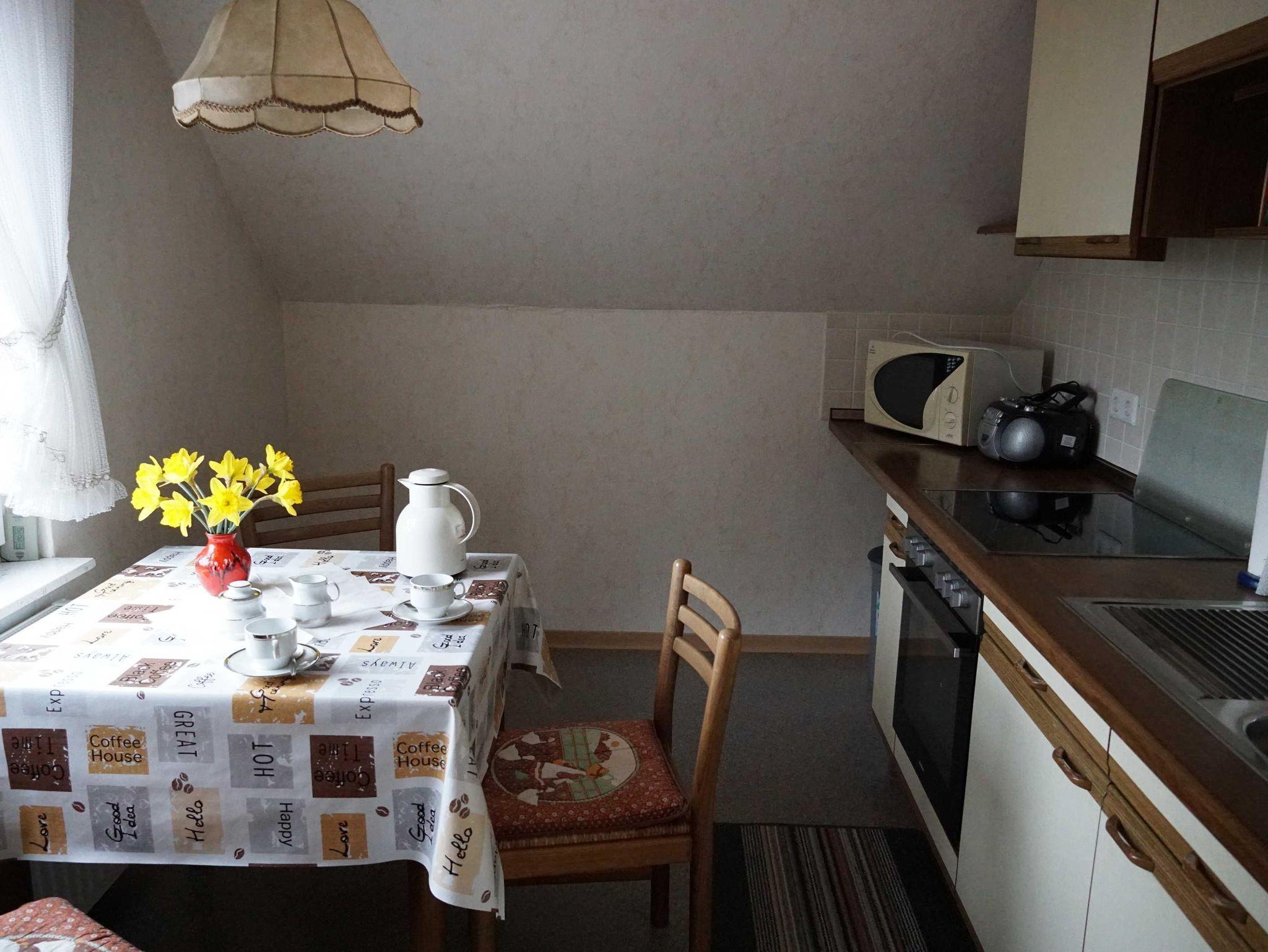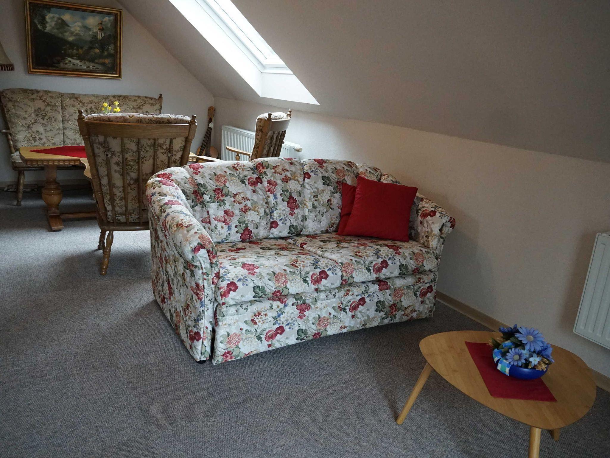 Die Ferienwohnung befindet sich im Obergeschoss. Das große Wohnzimmer mit Sitzgelegenheiten bietet ebenfalls Platz durch ein zusätzliches Schlafsofa. Somit können 3 Personen beherbergt werden. Im Badezimmer mit Dusche und WC befindet sich eine Waschmaschine. In der separaten Küche finden Sie neben Kühlschrank und Backofen eine Kaffeemaschine, Wasserkocher Mikrowelle und einen Toaster.