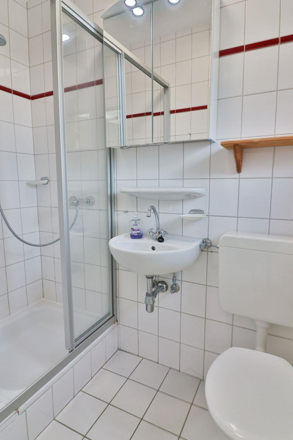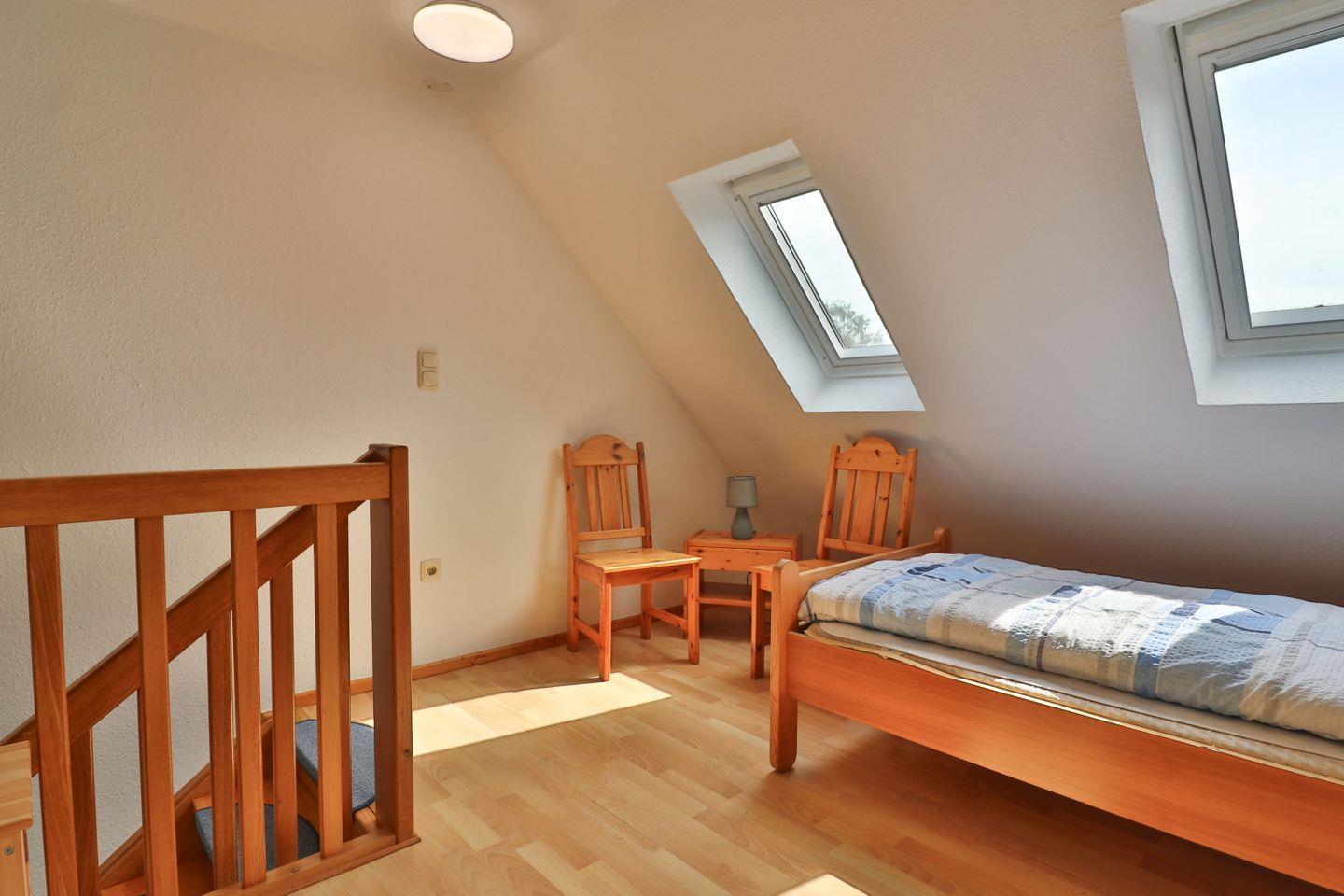 Ebenfalls im Erdgeschoss befindet sich das Badezimmer, das mit einer Dusche, Waschbecken, WC und einem Fön ausgestattet ist. Das Obergeschoss der Wohnung beherbergt das über eine offene Treppe erreichbare Schlafzimmer, das mit drei Einzelbetten, einem geräumigen Kleiderschrank und Verdunkelungsmöglichkeiten für alle Fenster ausgestattet ist, um einen erholsamen Schlaf zu gewährleisten.