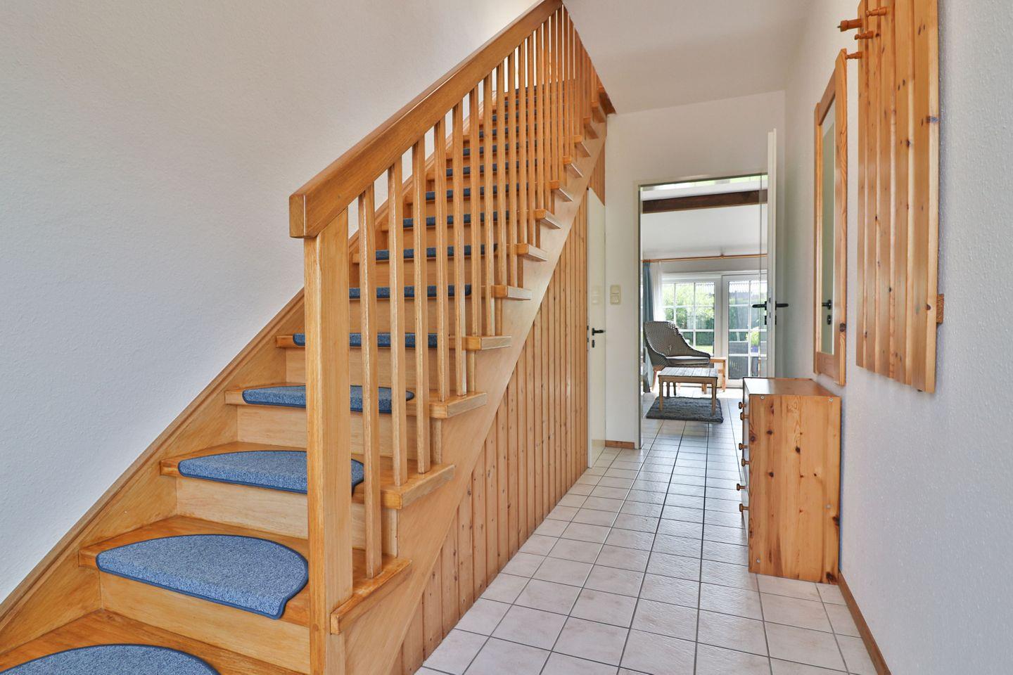 Im Erdgeschoss befindet sich der einladende Wohnbereich, der mit einem bequemen Sofa ausgestattet ist und zum Entspannen nach einem erlebnisreichen Tag einlädt. Der Essbereich bietet Platz für gesellige Abende, während die gut ausgestattete Küchenzeile alle notwendigen Utensilien bereithält: Ceranfeld, Backofen, Kühlschrank, Mikrowelle, Kaffeemaschine, Wasserkocher, Toaster und weitere Küchenutensilien, die Ihnen das Kochen erleichtern. Vom Wohnzimmer aus gelangen Sie direkt auf die Terrasse, die ruhig zur hinteren Seite des Hauses liegt und somit eine wunderbare Möglichkeit bietet, die frische Luft zu genießen.