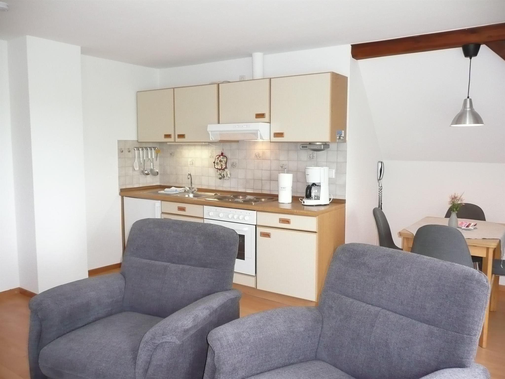 Ihren Urlaub genießen können Sie im Wohnraum mit komfortabler Sitzgruppe. Die Küchenzeile ist in den Wohnraum integriert.
