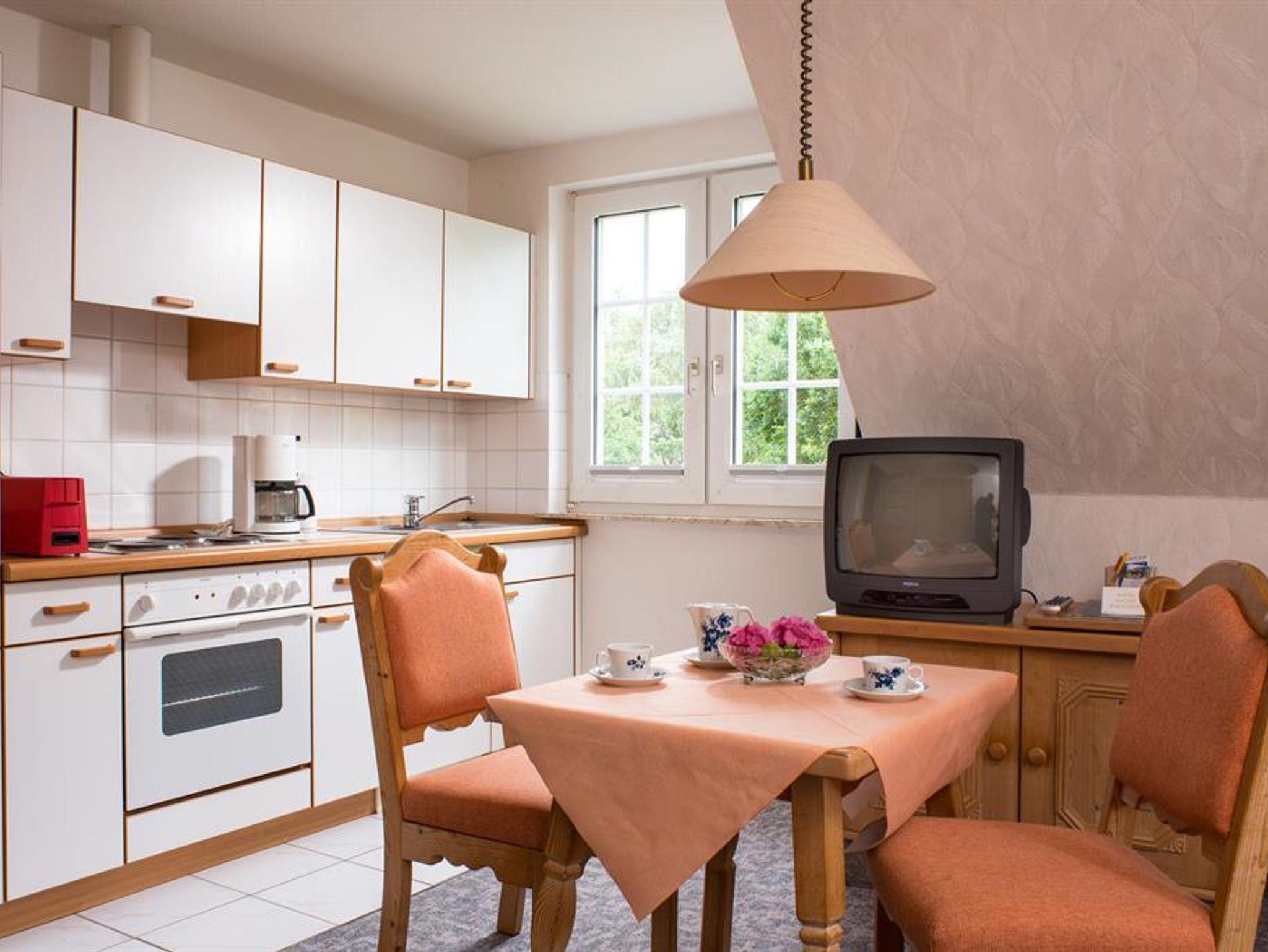 In unserem Zimmer für 1-3 Personen erwartet Sie ein Doppelbett mit TV, viel Stauraum, eine kleine Sitzgruppe, eine Küchenzeile mit Elektroherd, Kaffeemaschine, Toaster, Kühlschrank und Backofen, sowie ein Duschbad mit WC.