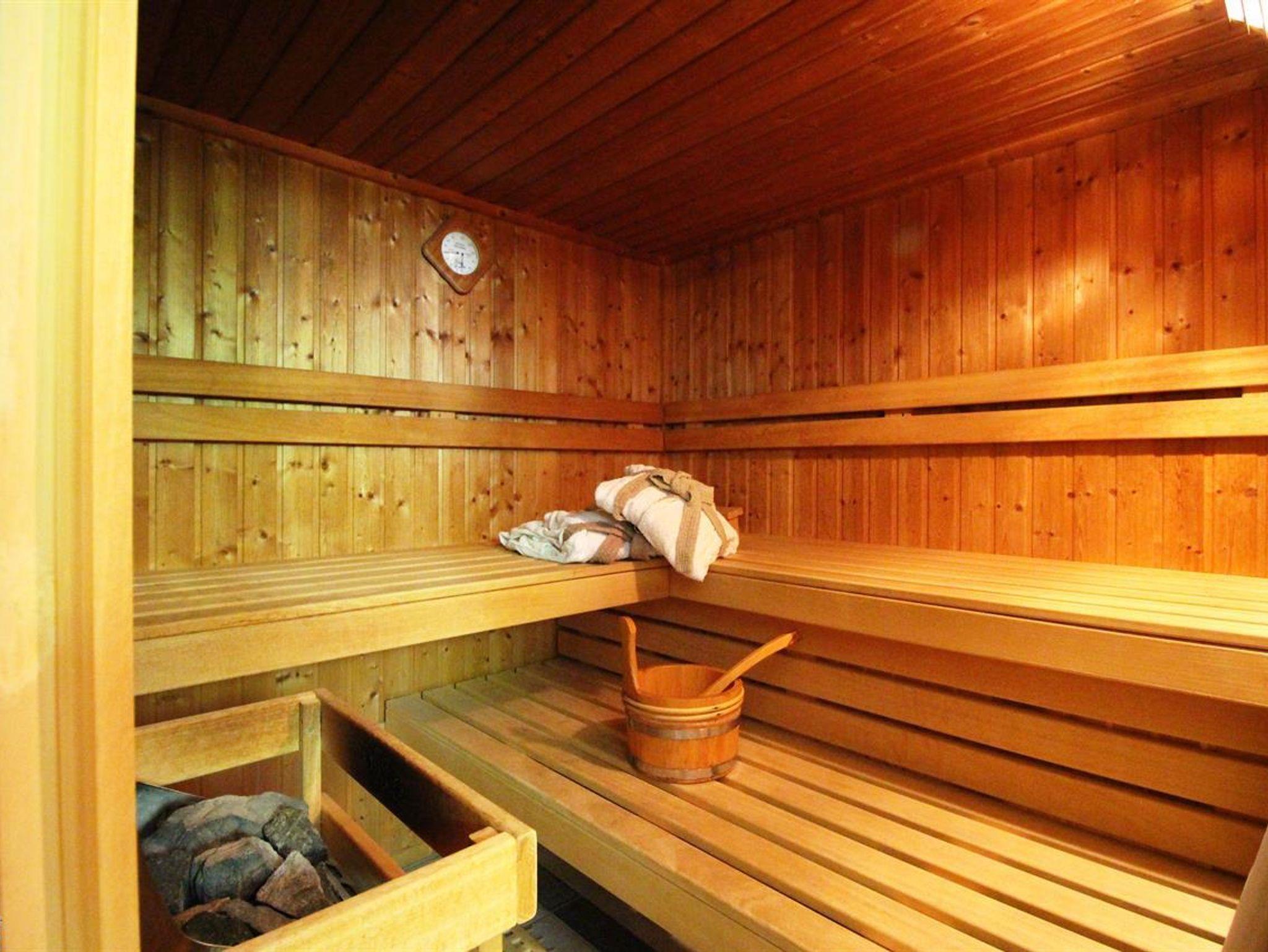 Das helle Badezimmer hat eine Fußbodenheizung, eine begehbare Dusche, Bidet und zwei Waschbecken, das Gäste-Duschbad mit Toilette hat ein Einzelwaschbecken. Verbringen Sie die ungemütlicheren Tage des Jahres doch in der eigenen Sauna. Zwei Ruheliege sowie eine Rain-Showerdusche sind vorhanden. Im loungeartigen, gemütlichen Esszimmer mit Kamin und kleiner Bibliothek finden alle Platz. Die voll ausgestattete separate Küche lädt mit dem zusätzlichen Essbereich, Geschirrspüler, Kühl-und Gefrierschrank, sowie Mikrowelle und großer Arbeitsfläche zum gemeinsamen Kochen ein. Im Wohnzimmer befinden sich eine Sitzgruppe, Fernseher, DVD und Stereoanlage.