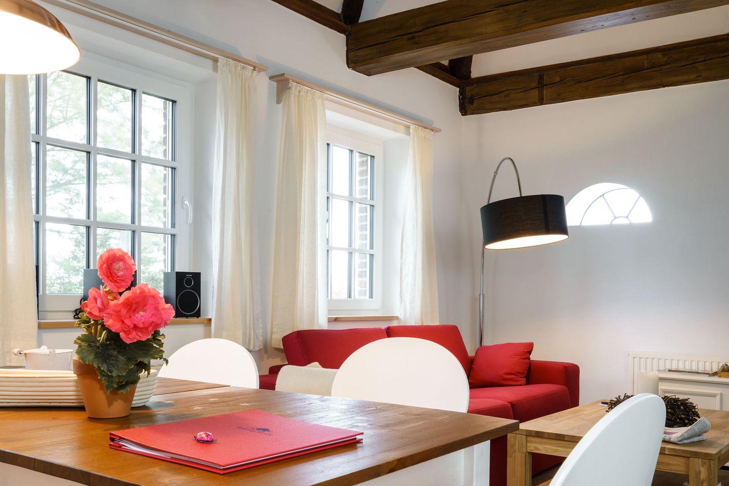 Charmante Ferienwohnung im restaurierten Haubarg Windschuur auf Eiderstedt, ideal für erholsame Tage nahe Meer und Natur.