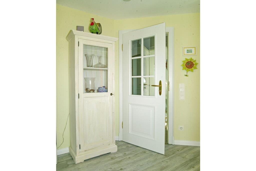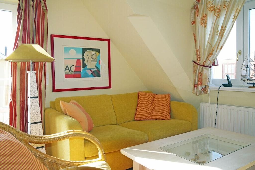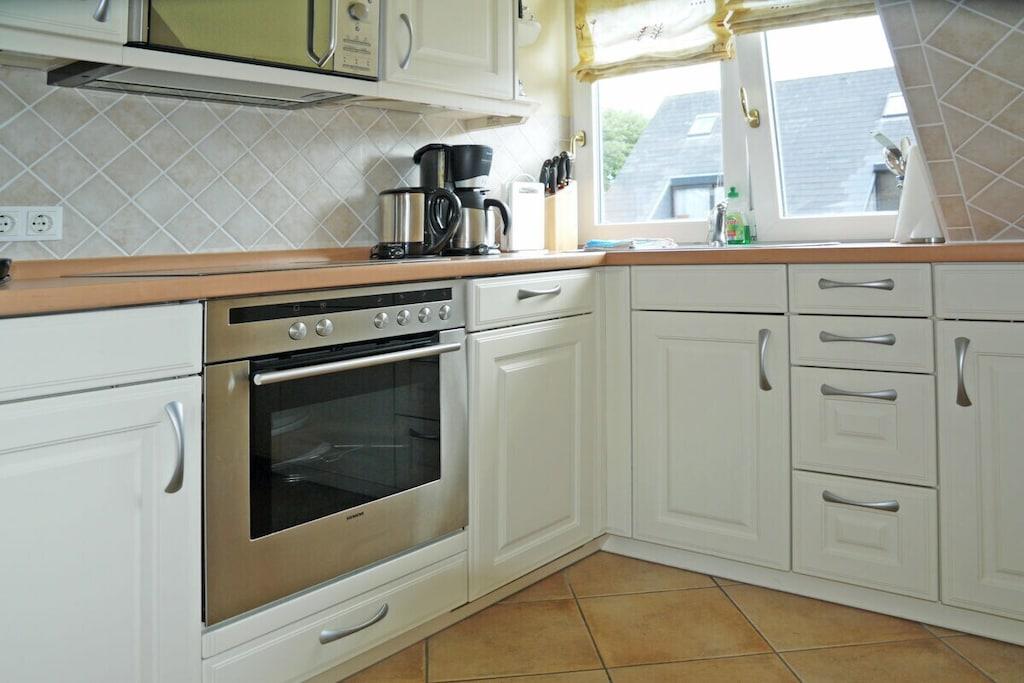 Im OG befindet sich der sehr helle Wohnbereich mit zwei großen Fenstern Richtung Ost und West und zwei Flügeltüren zum Balkon Richtung Süden. Der Balkon ist 6,5 m lang. Zwischen den Flügeltüren der Eßbereich. Die Wohnung ist modern möbliert. Das Sofa läßt sich in eine Bettcouch verwandeln und bietet einen sehr bequemen Schlafplatz. Die hochwertige Küchenzeile: Geschirrspüler, Herd (mit Backofen, Koch-Ceranfeld), Mikrowelle, Dunstabzugshaube, Espressomaschine. Duschbad und WC auf dieser Ebene. Weiter ein Schlafzimmer mit zwei Betten, die sich einzeln oder zusammen stellen lassen. Einbauschränke bieten großzügigen Stauraum. Wohn- und Schlafzimmer haben je 1 Fernseher. Eine Stereoanlage mit CD- und DVD-spieler im Wohnzimmer.