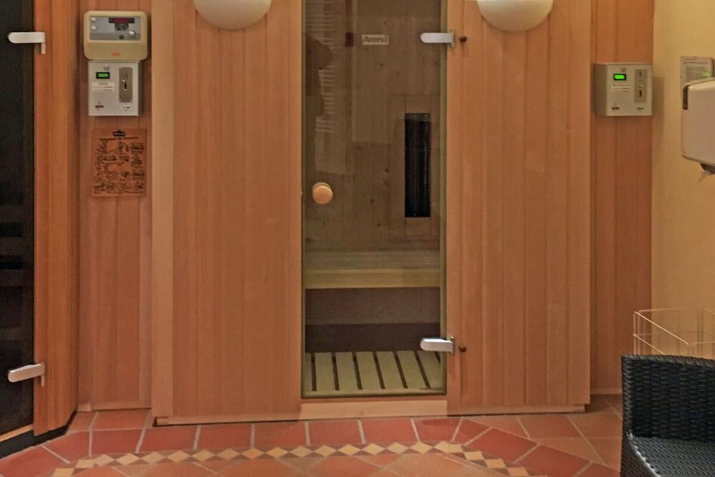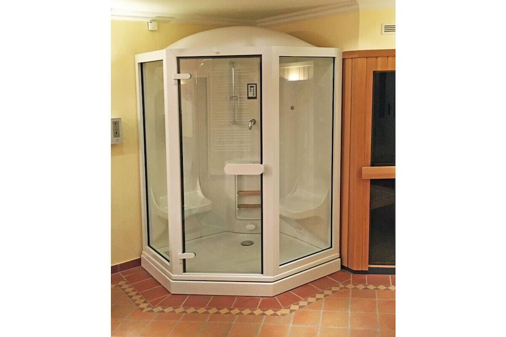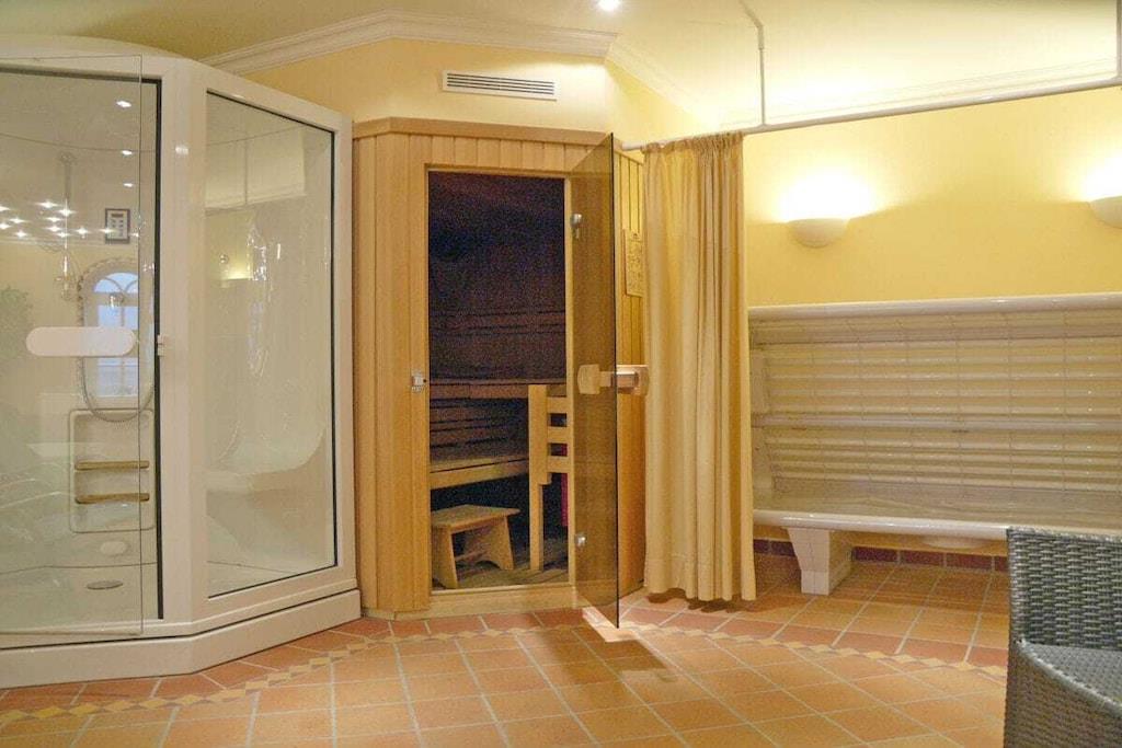 In der 2. Etage: (Eingangshalle(, ), Wohnzimmer(, , Bibliothek, Doppelschlafcouch, TV, DVD-Spieler, Radio, CD-Spieler, Stereoanlage), Küche(, Kochnische, Esstisch, Herd, Kochplatte, Wasserkocher, Toaster, Kochherd, Kaffeemaschine, Backofen, Mikrowelle, Spülmaschine, Kühlschrank, Küchenmaschine), Schlafzimmer(, Einzelbett, Einzelbett, TV, Radio), Badezimmer(, Toilette, Dusche, Waschbecken)) Souterrain: (Ruheraum(Sauna, Türkisches Dampfbad, Hottub)) , , , Internet, Internet, Trockner, Waschmaschine, Balkon(Gartenmöbel), Heizung, Parkplatz, Bügelbrett, Bügeleisen, Telefon