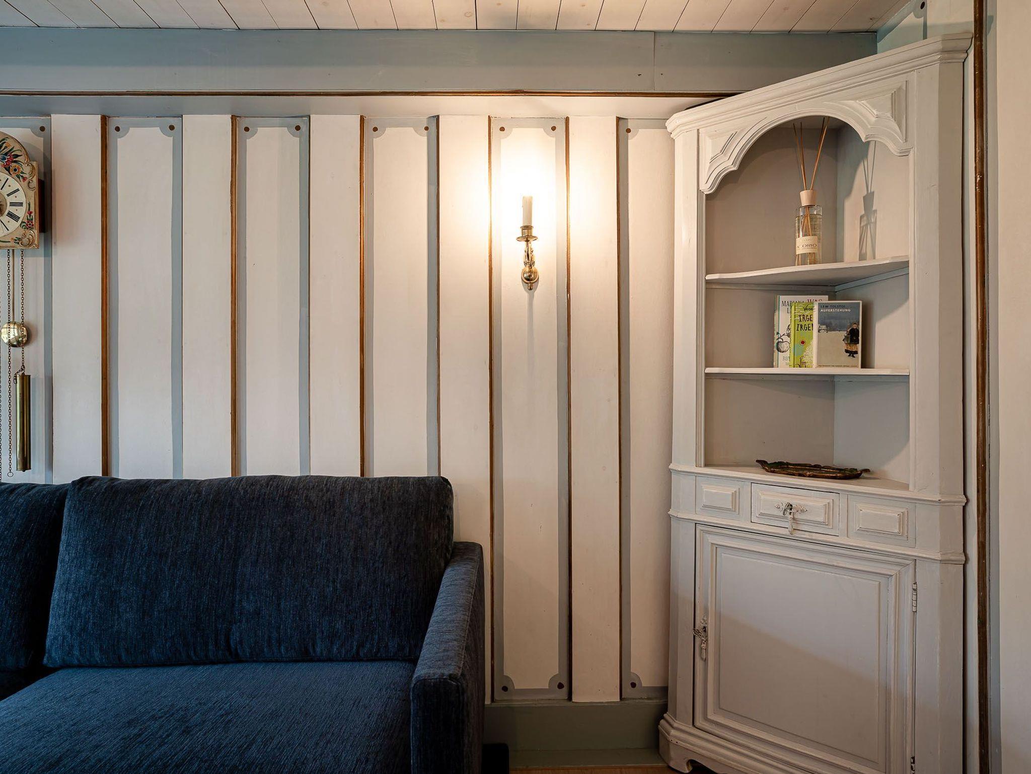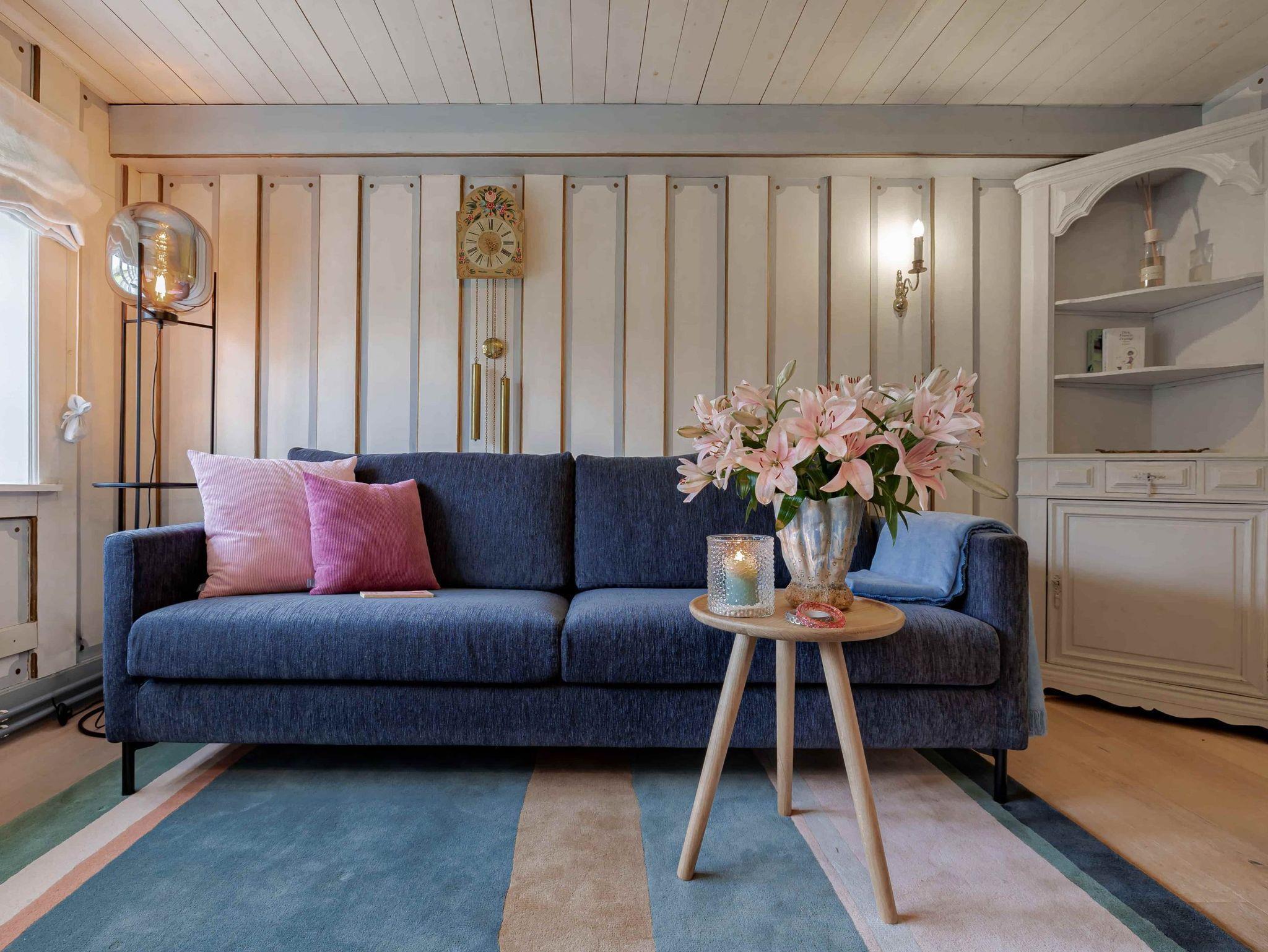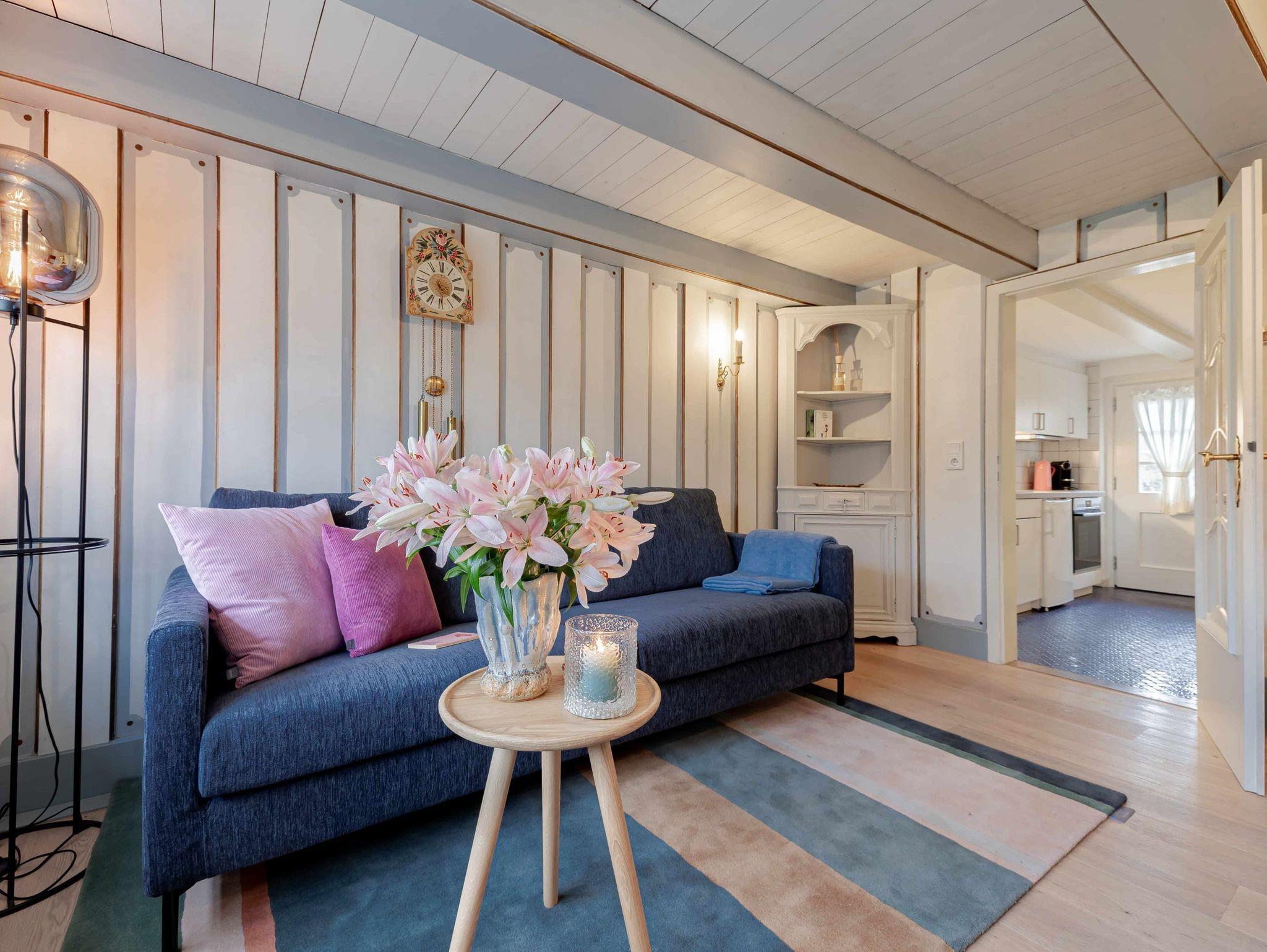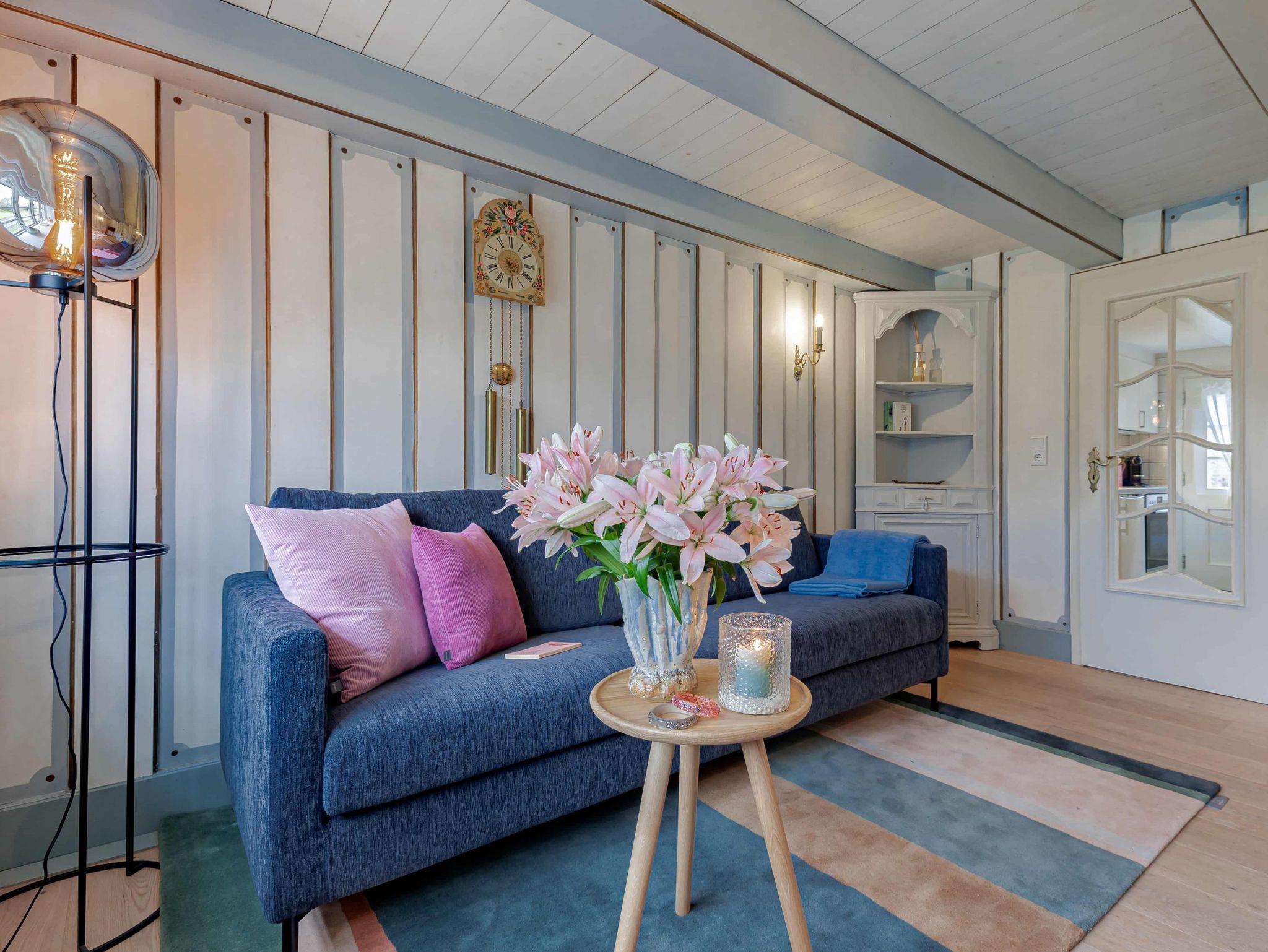 Auf zwei Stockwerken kommt die Mischung des alten Charmes und der modernen Einrichtung gut zur Geltung. Wenn Sie hereinkommen, stehen Sie direkt im Flur, wo sich auch die Küchenzeile befindet. Weiter durch können sie es sich im Wohnzimmer auf dem hellblauen Samtsofa gemütlich machen. Die wunderschöne, alte Junghans Uhr verleiht dem Raum einen ganz besonderen Charme und ist ein echter Hingucker. Auf der oberen Etage finden Sie das Schlafzimmer mit zwei gemütlichen Einzelbetten, direkt gegenüber befindet sich das Badezimmer mit Fenster und einer Dusche.