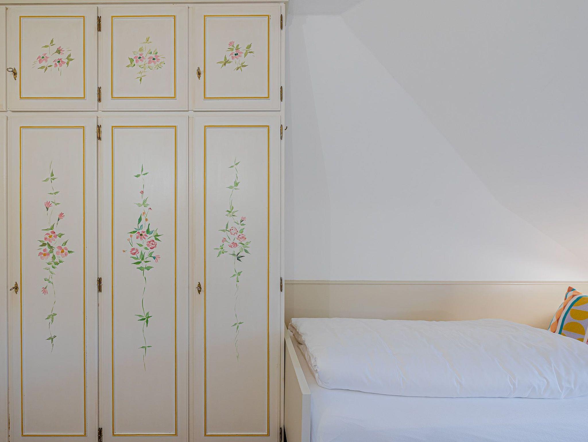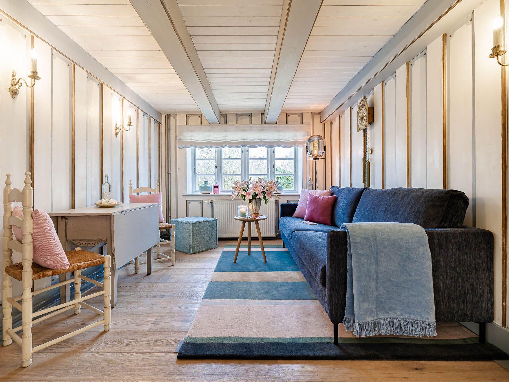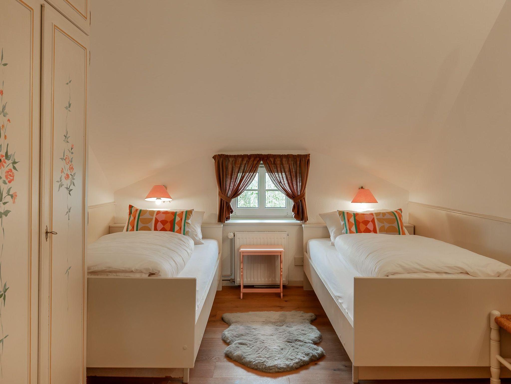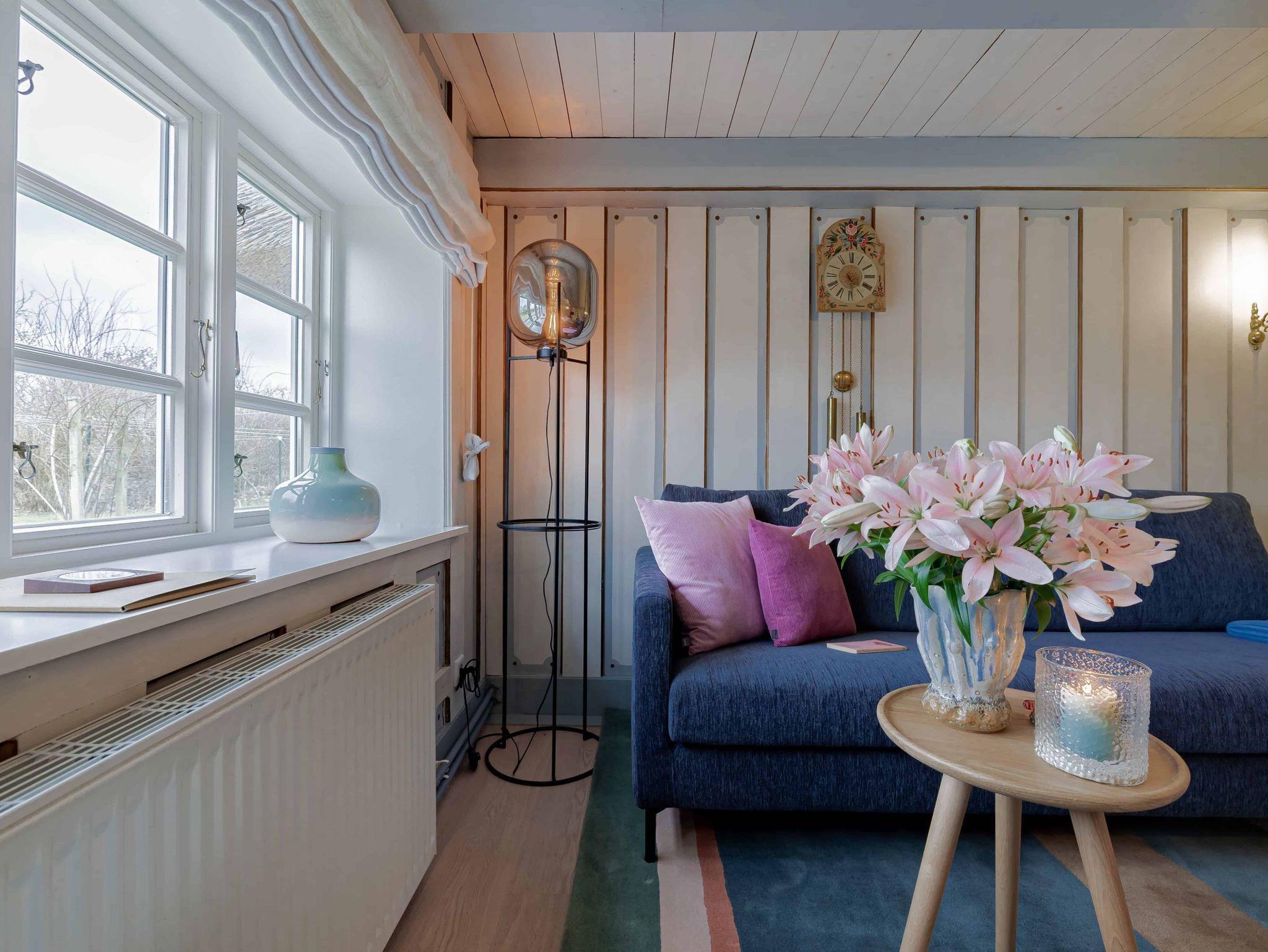 Auf zwei Stockwerken kommt die Mischung des alten Charmes und der modernen Einrichtung gut zur Geltung. Wenn Sie hereinkommen, stehen Sie direkt im Flur, wo sich auch die Küchenzeile befindet. Weiter durch können sie es sich im Wohnzimmer auf dem hellblauen Samtsofa gemütlich machen. Die wunderschöne, alte Junghans Uhr verleiht dem Raum einen ganz besonderen Charme und ist ein echter Hingucker. Auf der oberen Etage finden Sie das Schlafzimmer mit zwei gemütlichen Einzelbetten, direkt gegenüber befindet sich das Badezimmer mit Fenster und einer Dusche.